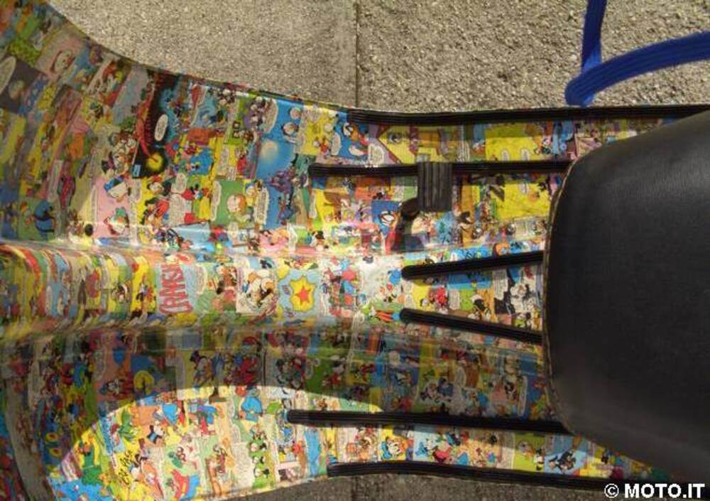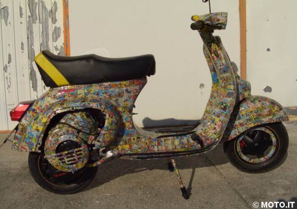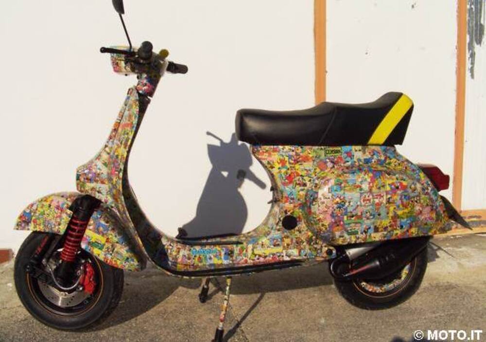 Questa simpatica Vespina, presente nelle nostre inserzioni di vendita dell'usato (leggi l'annuncio), accomuna gli innamorati dell'iconico scooterino italiano e gli amanti dell'immortale fumetto disneyano. Ed è principalmente quest'ultimo aspetto a catturare immediatamente l'attenzione, e a rendere molto particolare questa Vespa 50 Special degli anni settanta, resa molto ma molto più Special dal suo proprietario e venditore, Bruno di Modena: il quale l'ha resa un vero e proprio fumetto semovente ricoprendola pazientemente con le pagine di Topolino! Tecnicamente parlando, Bruno cita le modifiche più importanti apportate alla Vespina, tra le quali il motore da 150 cc preparato Polini con doppia alimentazione, e l'avantreno sostituito, con tanto di freno a disco. E' di conseguenza evidente che questo mezzo così particolare sarà molto difficilmente utilizzabile su strada... In pista, però...