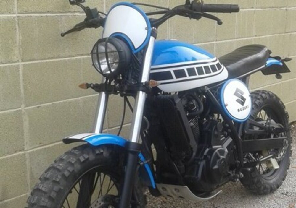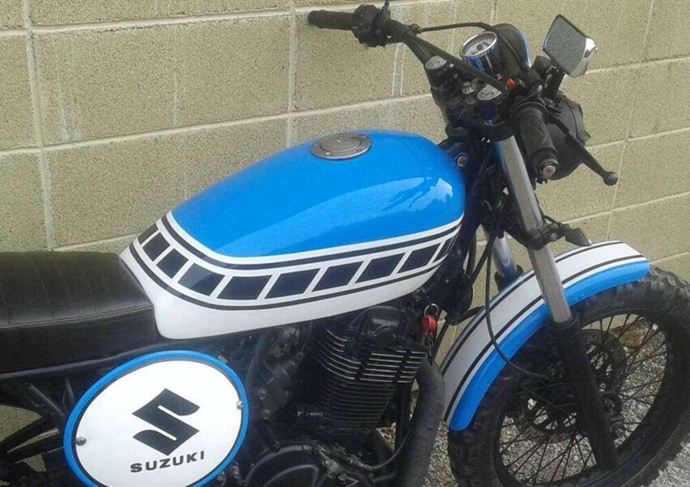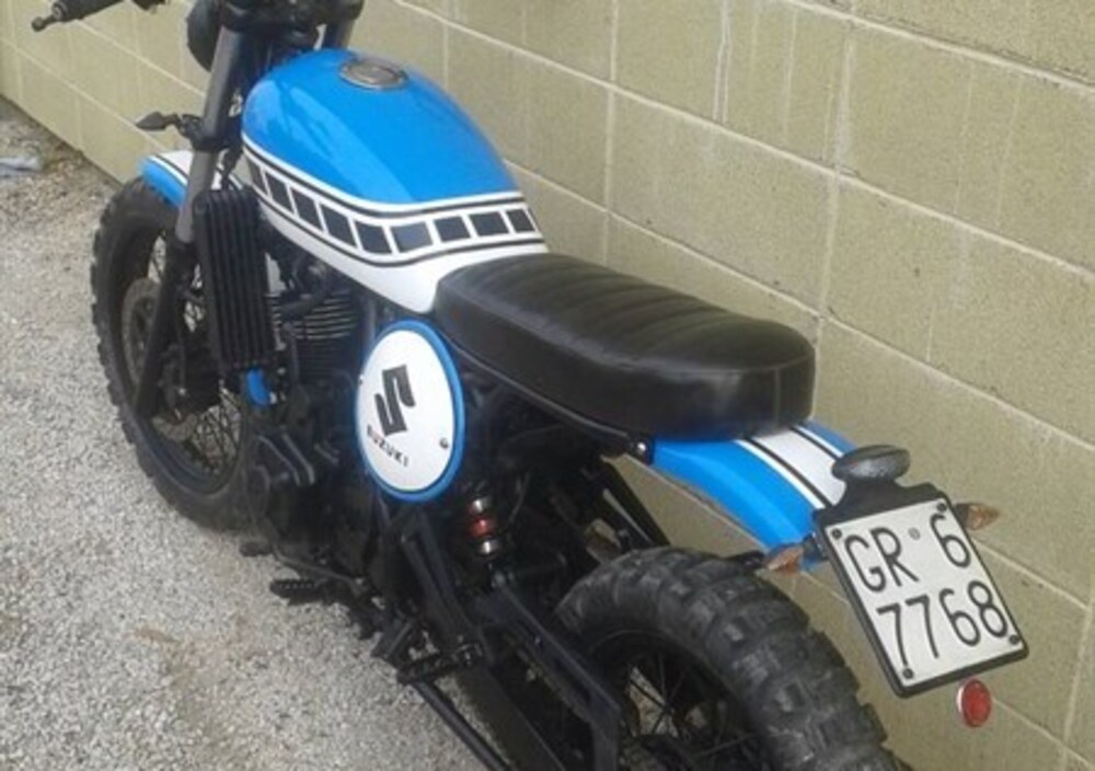 Questa scrambler – che per molti versi ci richiama anche il mondo del Dirt-Track – è nata sulla base della collaudatissima enduro Suzuki, nello specifico su un esemplare con soli 24.000km. La moto è stata completamente revisionata nelle sospensioni (al posteriore c’è una pregiata unità Bitubo) e nella ciclistica; il motore respira un po’ meglio grazie allo scarico – un’unità francese Megaton dotata di dB killer – e ad un filtro aria più liberi.