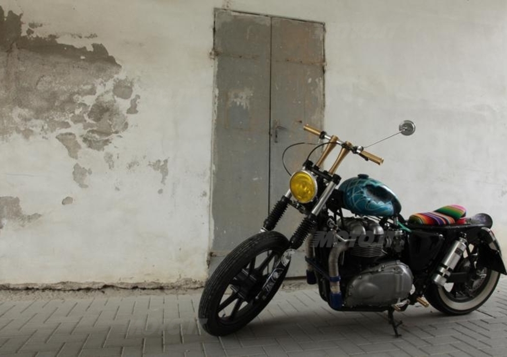 La verniciata è metalflake, mentre degli scarichi restano due corti tromboncini coperti dalla termobenda. I cerchi sono in lega, mentre il pedale del cambio e i riser del manubrio sono realizzati in ottone. I fanali non potevano che essere vintage.