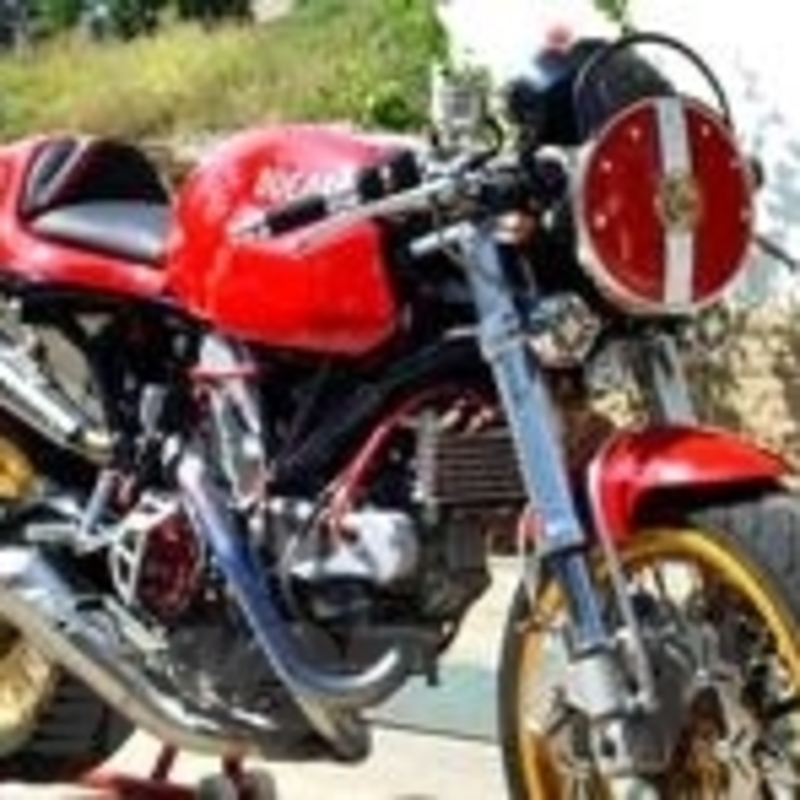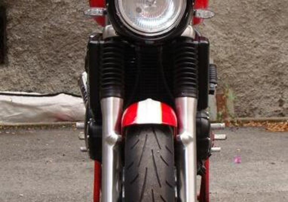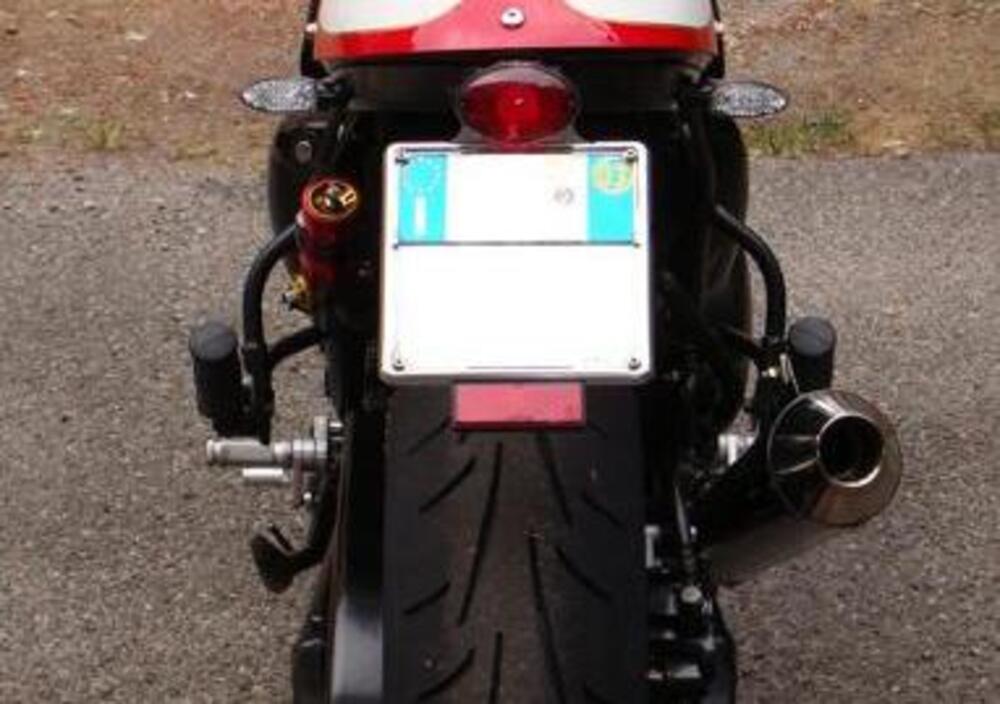 Cominciando dalle modifiche più evidenti si notano subito la verniciatura bianca e rossa con filetto oro e lo scarico unico Mas Moto sul lato destro (l’originale ne monta uno per ciascun lato). I cerchi sono CLF tubeless da 17".