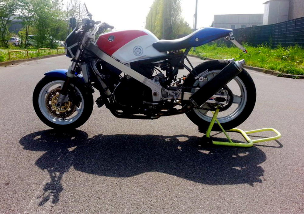 L’avantreno proviene direttamente da una CBR 900RR (e ha il pregio di mantenere il cerchio anteriore da 16” come sull’originale) e migliora l’efficacia dinamica pur risultando un po’ troppo muscoloso se paragonato al telaio. Al posteriore troviamo un telaietto modificato (sarebbe valsa la pena di realizzare due fianchetti che coprano il groviglio nella zona sotto il serbatoio) con la sella di una Ducati Monster e un codino monoposto. Naturalmente modificato il ponte di comando, con un faro tondo, un manubrio in pezzo unico da 28mm e strumentazione Koso.