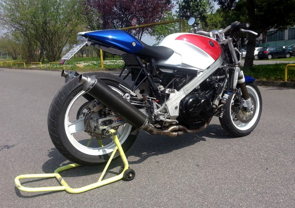 Il proprietario di questo esemplare l’ha trasformata spogliandola – presumiamo per rimediare a una scivolata di lieve entità, vista la mancanza di segni sul telaio – ed aggiornandola nella ciclistica e nelle sovrastrutture; il motore è stato infatti lasciato di serie, al netto dell’adozione di due terminali di scarico Arrow in fibra di carbonio.