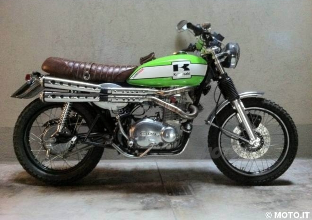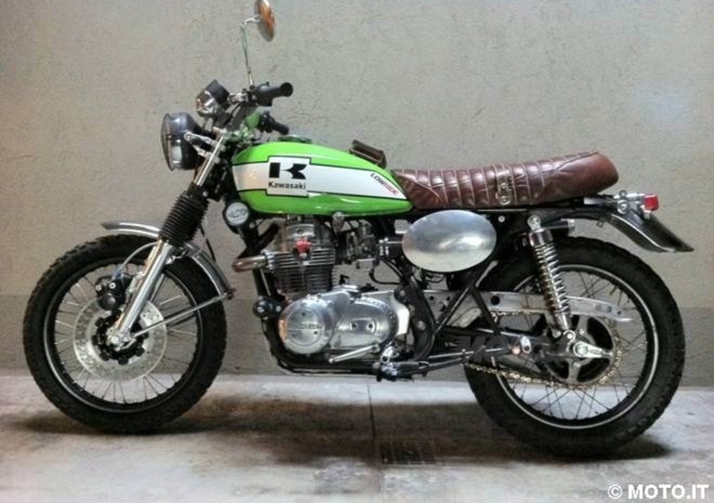 Stavolta tocca ad una Kawasaki Z400 del 1975, nella versione con freno a disco anteriore, che il proprietario ha profondamente modificato per trasformarla da tranquilla stradale in aggressiva scrambler, partendo ovviamente dallo scarico alto de rigueur per i canoni estetici del genere. Il doppio scarico originale viene profondamente modificato per spostare entrambi i silenziatori sullo stesso lato della moto.