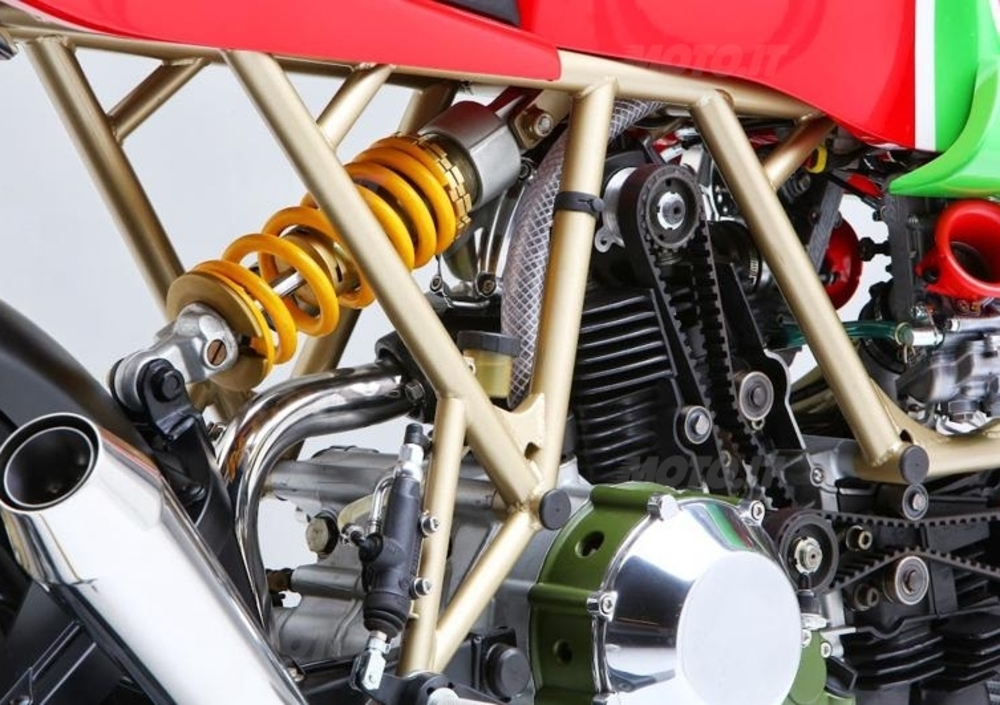 Il nuovo telaio in traliccio di tubi d'acciaio al cromo molibdeno 4130 ricorda quello Ducati ma è anche visivamente, oltre che sulla bilancia, più snello ed essenziale. Il forcellone con sospensione monocross adotta un ammortizzatore Ohlins e l'impianto frenante è un Brembo che rinuncia alle pinze radiali ma non alla qualità dell'insieme.