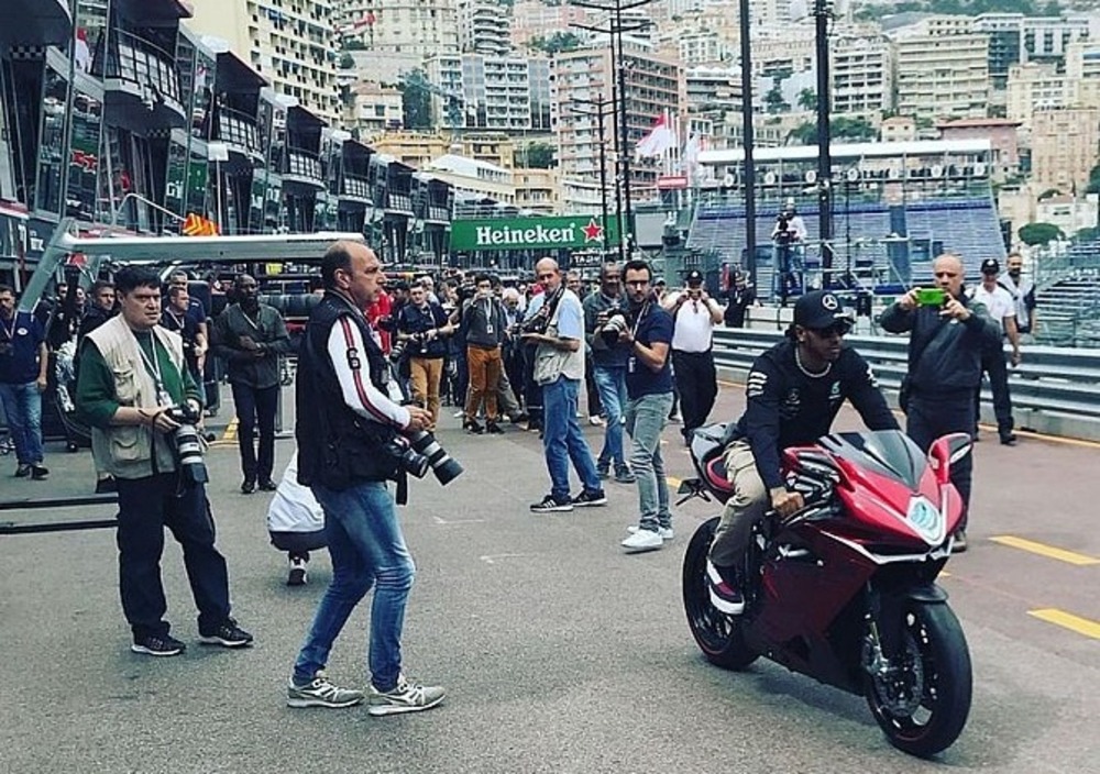 Con la “sua” F4 Hamilton è arrivato stamattina nel paddock di Montecarlo, e con questa moto si muoverà sulle strade del Principato, nel fine settimana dedicato al GP più affascinante della stagione. Forse adoperando un casco anonimo, più che a capo scoperto come ha fatto stamani.