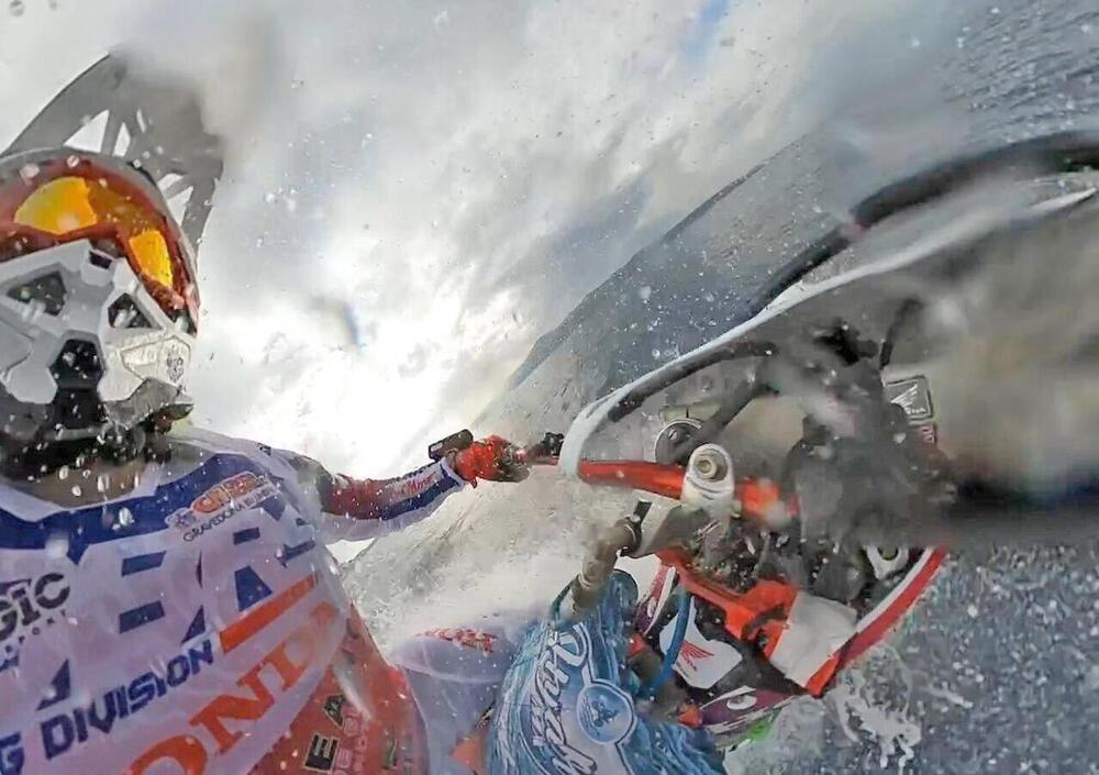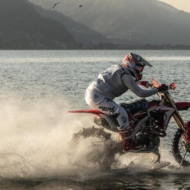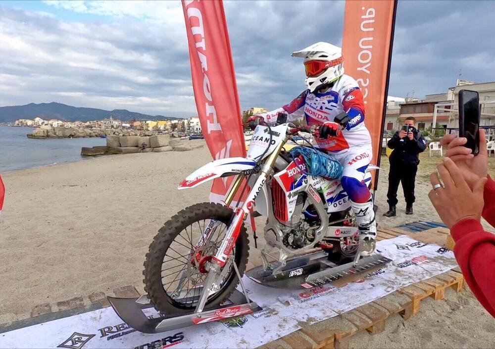 Già dalle prime ore del 29 maggio Luca era pronto per partire dalla spiaggia di Torre Faro (Messina), in attesa del via dalla Capitaneria di Porto che imponeva alcuni stop per il passaggio di navi e traghetti, e poco prima delle 8 entrava in acqua con la sua Honda CRF 450R. Purtroppo dopo avere percorso circa 500 metri una serie ravvicinata di onde, sommate alla corrente, hanno fatto uscire più volte dall’acqua la ruota posteriore, mandandola in cavitazione quando mancavano ancora circa 2,7 chilometri al traguardo. Un bagno imprevisto quindi per la moto, che sotto i 55,6 km/h fatica a restare a galla ma che è comunque rimasta sostenuta dai dispositivi di sicurezza, e tentativo andato a vuoto per Luca, il quale però non demorde: “La giornata di oggi sembrava ideale, avevamo preparato tutto ma sono stato fermato più volte a causa del traffico navale. Quando finalmente ho avuto il via libera sapevo della corrente nella parte centrale dello Stretto ma ignoravo la presenza di onde provocate da due navi cargo che erano passate una ventina di minuti prima. L’ingresso in acqua è stato facile, ho messo la terza e poi la quarta marcia e tutto andava bene finché non ho incontrato questa serie di onde che non era possibile vedere da riva. Ho superato le prime ma una ha rallentato la corsa fino a farmi fermare. In cinque anni non mi era mai successo, la considero un’esperienza di cui fare tesoro ma non ho intenzione di mollare e voglio certamente ritentare l’impresa. Sono in Sicilia da due settimane, sapevo che lo Stretto sarebbe stato un osso duro e ho potuto constatare di persona le variabili che hanno reso famoso questo tratto di mare. Nella vita a volte si vince, altre volte si impara e non dobbiamo dimenticare che ogni errore ci avvicina al nostro obiettivo. Non sono abbattuto, mi sento invece carico di una gran voglia di riprovare, questa avventura non finisce qua!”