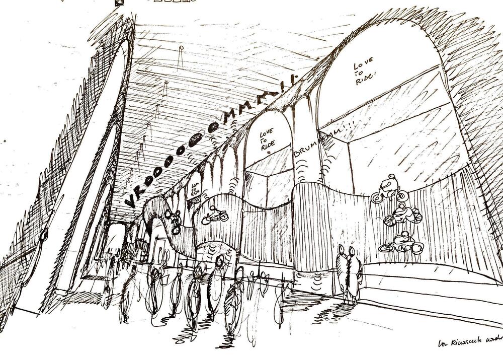 Merito dell’architetto Cristiano Urban, chiamato a delineare le forme di una struttura che avvolgerà l’interno colonnato del centralissimo store, dando vita ad un’opera mai realizzata prima, nella storia di Milano. Uno spazio - il porticato che delimita la facciata d’ingresso della Rinascente - che per una settimana proietterà, in questa maniera, i suoi visitatori all’interno di un’attrazione da luna park. È il wall of death, per gli americani, o il tamburo, come si diceva dalle nostre parti: una pista circolare, in legno, che gli stuntman percorrevano senza soluzione di continuità, sfidando la forza di gravità a bordo delle rispettive motociclette.