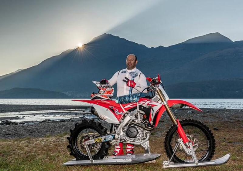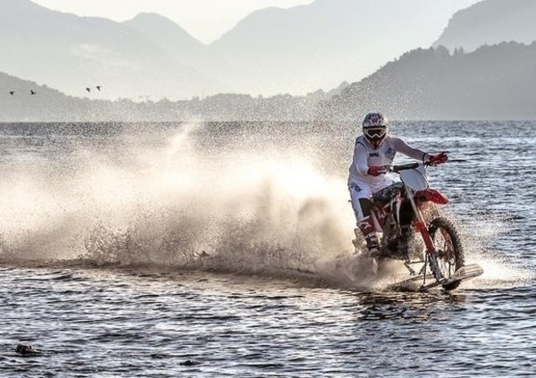 Per vincere questa sfida a distanza il pilota milanese userà una Honda CRF 450R dotato di pattini nautici e di una ruota posteriore con pale speciali che forniranno la spinta idrodinamica necessaria a far planare sull’acqua gli oltre 205 kg della moto.