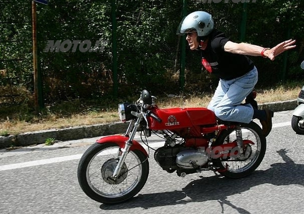 In sella alla sua Motobi 125 replica Zanzani, o a cavalcioni della sua Lambretta, ha compiuto imprese folli, come la salita della Madonna della Ripa senza mani, col gas puntato a oltre 60 orari di media. Con la Motobi ha stabilito un altro record: all’interno di una pista di auto-modellismo ha guidato in piedi, senza mani per 5 minuti. Un antesignano degli odierni stuntmen.