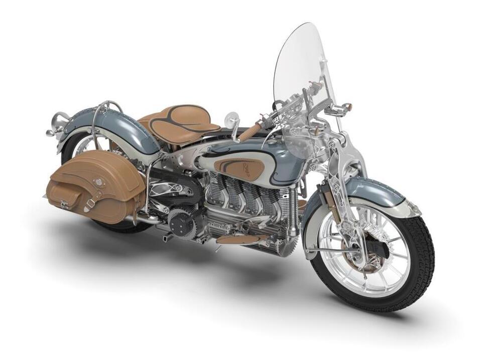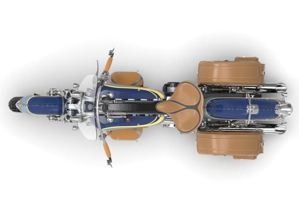 Altra cosa che sappiamo è che il cambio è a tre marce ed è comandato da una leva sulla parte superiore del serbatoio, con frizione centrifuga. Quello che nel mondo biker si chiama "suicide shifter" e vi lasciamo interpretare la traduzione. Mancano invece sia la batteria sia l'avviamento elettrico: vuoi non mettere in moto questo bel quattro cilindri 1800 con un bel colpo di pedivella? Curiosamente, infine, la trasmissione finale è a catena e non ad albero, soluzione congeniale ad un motore longitudinale come questo.