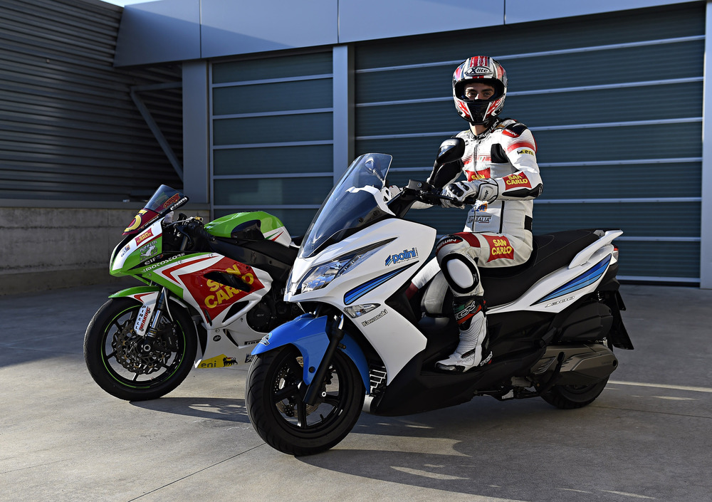 Il lavoro di preparazione è culminato con un simpatico test che ha avuto per protagonisti appunto il Kawasaki J300 e Marco Faccani, attuale detentore del titolo europeo Superstock ed impegnato nel 2015 nel Mondiale Supersport con la Kawasaki ZX-6R. Marco, che utilizza il J300 quotidianamente per i suoi spostamenti a Ravenna (dove vive) e nel paddock del mondiale, è sceso entusiasta delle prestazioni dello scooter elaborato con le nuove componenti Polini.