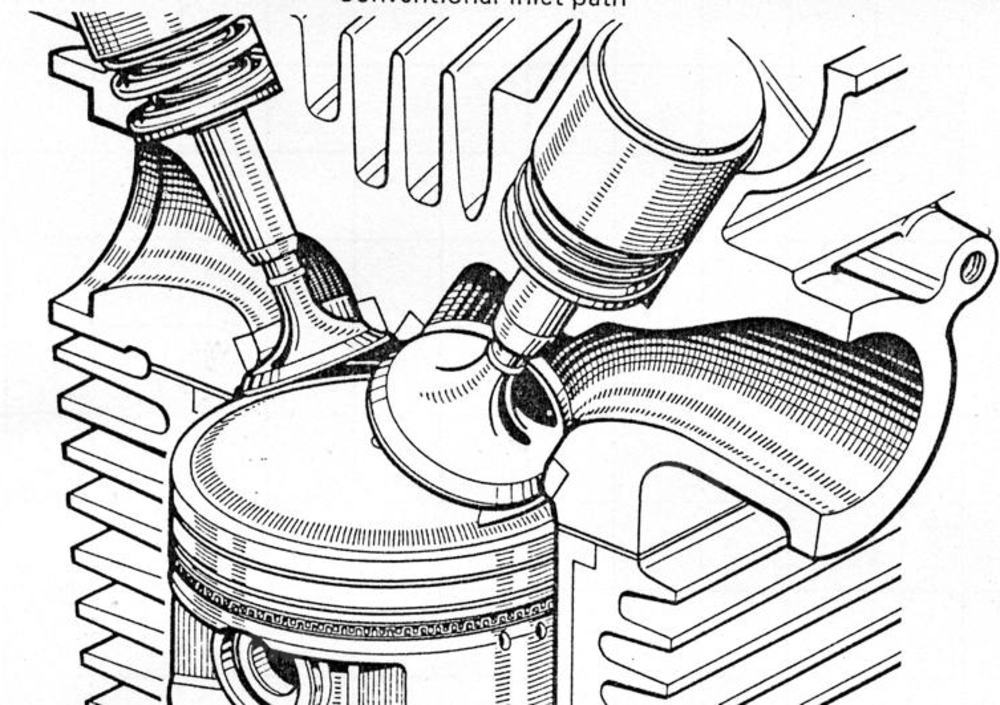 E qui entra in gioco l’angolo incluso tra le due valvole. Mano a mano che esso aumenta diventa possibile installare valvole più grandi: questo ha portato in passato all’adozione di angoli molto grandi, in particolare nei motori da corsa. E in tal caso c’era una seria controindicazione: per ottenere un rapporto di compressione molto elevato occorreva montare un pistone col cielo fortemente bombato. Di conseguenza aumentava il peso del pistone stesso (che era anche soggetto a maggiori sollecitazioni termiche) e la forma della camera peggiorava, avvicinandosi a quella che potremmo definire a “scorza d’arancia”. In questo modo il rendimento termico diminuiva e l’avanzamento del fronte di fiamma, durante la combustione, era tutt’altro che agevole e “lineare”. È per questa ragione che in diversi motori di una volta poteva risultare vantaggiosa l’adozione della doppia accensione, anche se l’alesaggio era modesto.