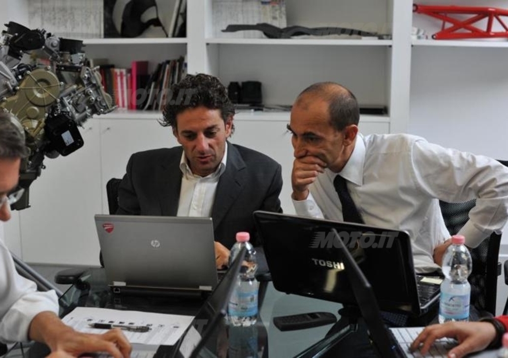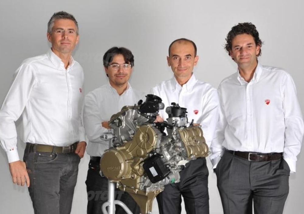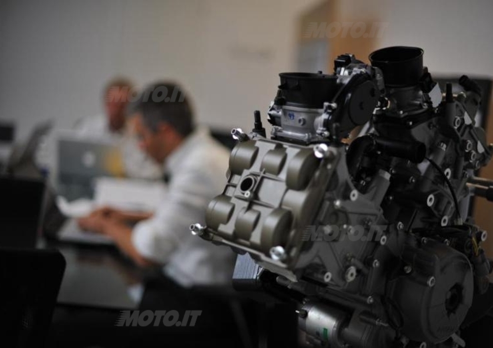Esaminandone le caratteristiche spicca immediatamente l’adozione di un alesaggio record (112 mm!), che viene abbinato a una corsa di 60,8 mm, sensibilmente inferiore a quella dell’attuale 1198 (67,9 mm). E’ chiaro che le nuove misure consentono di raggiungere velocità di rotazione più elevate, a parità di sollecitazioni meccaniche, e al tempo stesso di fare respirare meglio il motore grazie alle valvole di maggiori dimensioni. Ora quelle di aspirazione hanno un diametro di 46,8 mm alla aspirazione (contro i 43,5 mm di quelle del 1198 Evoluzione) e quelle di scarico di 38,3 mm (contro 34,5). Si tratta di misure che, unitamente al diametro equivalente dei corpi farfallati (67,5 mm, contro i 63,9 del 1198), parlano da sole.