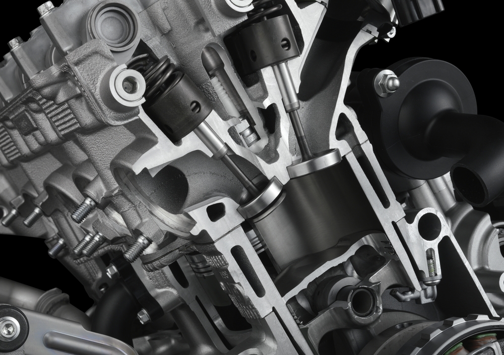 Non è solo l’impiego di queste bielle a tradire l’impostazione davvero corsaiola di questo motore. Un particolare particolarmente significativo è costituito dalla mandata olio ai cuscinetti di biella per mezzo di una canalizzazione dell’albero con ingresso assiale, come nei motori delle MotoGP. A livello di testa (riprogettata e ora con angolo tra le valvole leggermente diminuito), molto indicativo è anche il passaggio ai bilancieri a dito per il comando delle valvole.