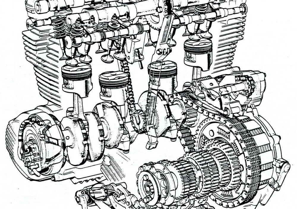 Nelle moto inglesi, come del resto nelle Laverda 750 e 1000/1200, questo non era necessario e l’albero a gomiti girava in avanti in quanto il cambio era del tipo con presa diretta (ovvero con il manicotto di uscita coassiale con l’albero di entrata e ruotante nello stesso verso).