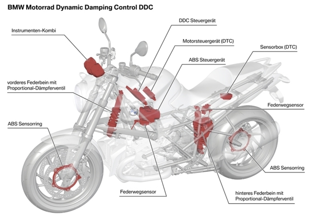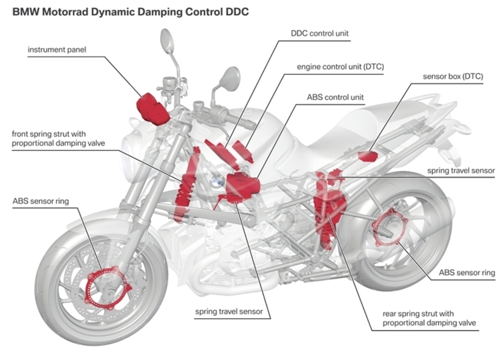 Lo sviluppo tecnologico è sempre intenso, presso la Casa bavarese. In particolare, quello della ricerca e dello sviluppo a livello di sospensioni è da molto tempo a questa parte uno dei settori nei quali i tecnici della BMW si impegnano maggiormente. Nessun altro costruttore ha in produzione una tale varietà di sospensioni anteriori, tanto per cominciare. Alla classica telescopica, infatti si affiancano da tempo l’efficace e versatile Telelever e l’eccellente Duolever. Inoltre, la BMW ha dedicato particolare attenzione anche alla possibilità di regolazione e di controllo delle funzioni molleggiante ed ammortizzante, realizzando nel 2004 l’ESA (Electronic Suspension Adjustment), evolutasi nell’ESA II del 2009. Questi sistemi consentono al pilota di scegliere tra varie regolazioni, in modo da adattare il comportamento delle sospensioni ai loro gusti e alle loro esigenze. Ora i tecnici bavaresi sono andati ancora oltre, con il DDC (Dynamic Damping Control), un sistema di sospensioni semiattivo, che interviene in maniera automatica durante il funzionamento della moto e che è stato messo a punto utilizzando largamente il consolidato know-how acquisito dalla azienda in campo automobilistico.