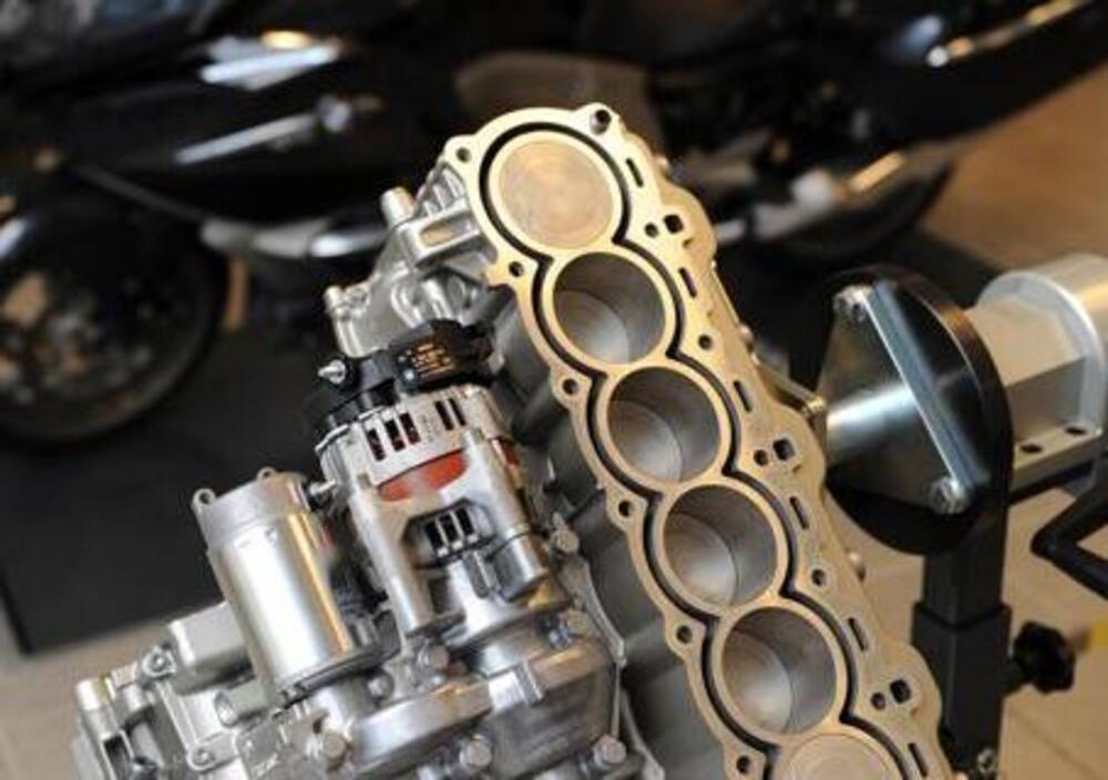 Siamo di fronte a un motore bialbero con quattro valvole per cilindro, disposte su due piani inclinati tra loro di 25°, che eroga ben 160 CV, a un regime di soli 7500 giri/min, al quale corrisponde una velocità media del pistone (16,9 m/s) di tutto riposo, per gli standard moderni, abbinata però a una pressione media effettiva decisamente cospicua (11,8 bar, che salgono a ben 13,8 al regime di coppia massima), a testimonianza di un rendimento complessivo eccellente. Il rapporto geometrico di compressione (12,2) è elevato per una moto da gran turismo, ed è stato adottato proprio per ottenere un ottimo rendimento termico, mentre le valvole di aspirazione di grande diametro (con i loro 29 mm sono praticamente le più grandi che possono essere installate, con un alesaggio di 72mm), unitamente ai condotti di aspirazione dalla geometria accuratamente studiata, sono state adottate per conseguire un eccellente rendimento volumetrico. A proposito del sistema di aspirazione, è rimarchevole l’impiego di un unico corpo farfallato, posto a monte dei condotti, secondo uno schema tipico della scuola automobilistica. Nelle moto di norma ce ne è uno per ogni cilindro.