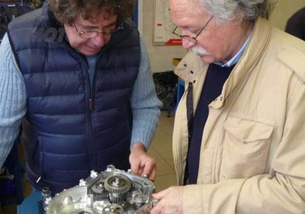 La trasmissione primaria a ingranaggi e la frizione a dischi multipli sono alloggiati in un vano ricavato sul lato destro del basamento, e vengono lubrificate da un olio diverso dagli altri che lubrificano rispettivamente motore e cambio. La camera di manovella è isolata dal resto del motore e le pulsazioni di pressione determinate dal movimento dei pistoni vengono sfruttate per espellere l’olio (tramite due passaggi controllati da valvole a lamelle) in modo da ottenere una lubrificazione a carter semisecco, con perdite per sbattimento estremamente ridotte. La coppa nella quale si raccoglie il lubrificante del motore è collocata sotto all’alloggiamento del cambio, dal quale risulta completamente separata. Cambio "naturalmente" estraibile (giusto per non farsi mancar niente), anch'esso realizzato in casa e disponibile con 4, 5 o 6 rapporti.