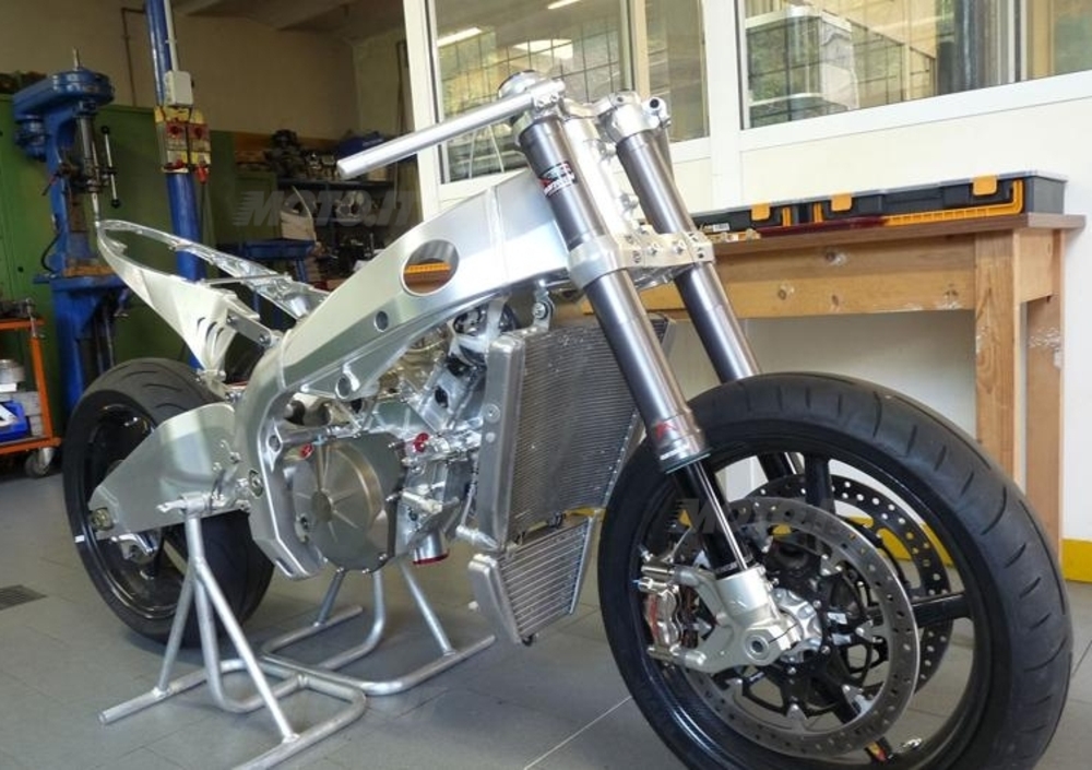 Di questo motore, che pesa 51 kg, è prevista la realizzazione di varianti di 1.100 e 1200 cm3, che andranno a equipaggiare moto di tipi differenti (una di esse sarà una "endurona da viaggio" con telaio a traliccio in titanio e piastre in magnesio). Il primo modello, cioè il prototipo che abbiamo potuto anche testare brevemente, è però dotato di una classica struttura a doppio trave in lega di alluminio del peso di 12 kg, progettata ex-novo dai giovani progettisti che collaborano con la Vertemati Factory alla macchina utensile, dotato di razionali nervature nella parte interna. Quanto al massiccio forcellone, anch'esso in lega di alluminio, è lo stesso realizzato dall'olandese Ten Kate per le Honda Superbike, e ha una lunghezza di ben 600 mm: le quote della ciclistica, di conseguenza, sono da considerarsi allo stato dell’arte, con un interasse di 1.420 mm, una avancorsa di 98 mm e una inclinazione del cannotto di sterzo di 23°.