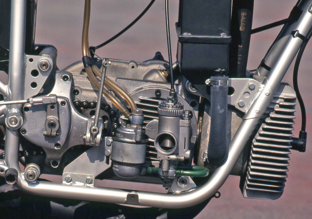 Occorre montare un carburatore a ogni lato del basamento, cosa che in genere è OK nelle 125 (tanto di serie quanto da competizione) e può essere senz’altro accettabile nelle stradali anche di cilindrata notevolmente superiore; non si può dire però proprio lo stesso per quanto riguarda le moto da Gran Premio di 250 cm3 e oltre. Viene penalizzata la penetrazione aerodinamica, in quanto la sezione frontale diventa molto considerevole, con una larghezza che può addirittura avvicinarsi a quella di una moto maggiormente frazionata e/o di cilindrata nettamente superiore. Questo ha portato la MZ a realizzare un motore con i cilindri disposti “in tandem”, nel quale cioè si impiegavano due alberi a gomito individuali, in presa tra loro, e c’erano due camere di manovella, disposte una davanti all’altra. In pratica, è come se a un monocilindrico ne venisse aggiunto un altro, prolungando il basamento. Le moto della casa tedesca dotate di cilindri in tandem sono rimaste allo stadio di prototipo (la 125 è apparsa nel 1969 e la 250 nel 1971). Questa stessa architettura è stata però ripresa qualche anno più tardi con eccezionale successo dalla Kawasaki con la KR (realizzata in versioni di 250 e di 350 cm3, ha conquistato ben otto titoli iridati) e dalla Rotax con il bicilindrico tipo 256, di 250 cm3.
