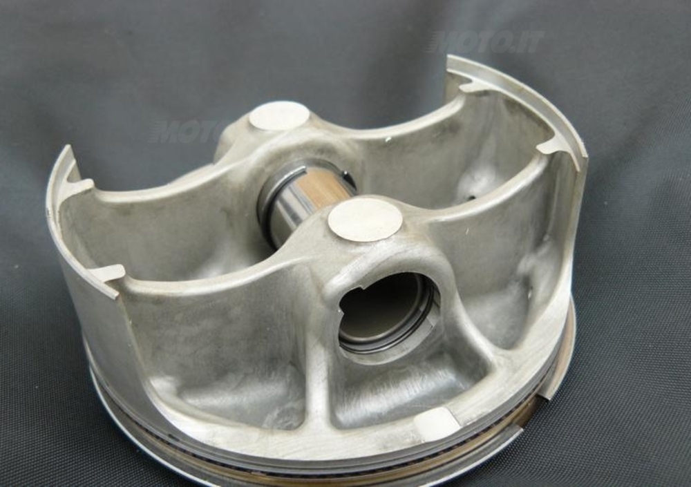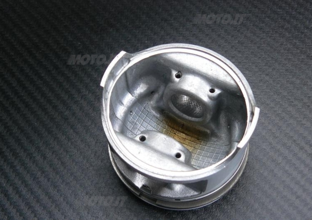 Il confronto tra le due immagini consente di visualizzare agevolmente le differenze tra un pistone fuso, a sinistra, e uno forgiato, destinati rispettivamente a una versione più tranquilla (Kawasaki 636) e a una più spinta (ZX-R 600) di uno stesso motore
