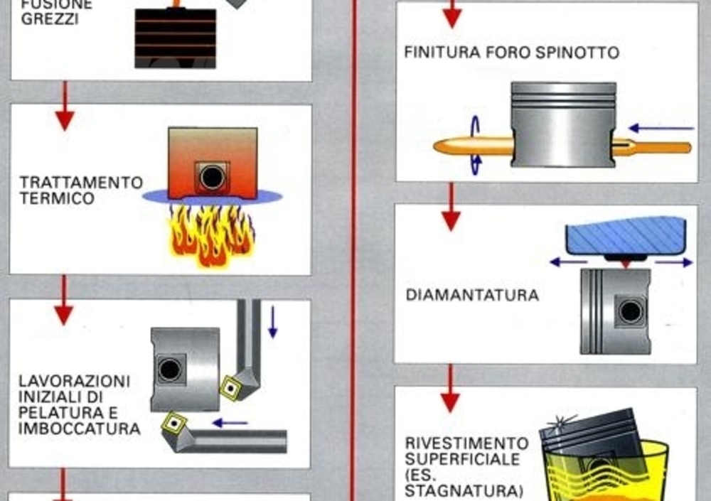 Alcuni organi meccanici sono così specialistici che i costruttori di motori non li realizzano internamente; sia per la progettazione che per la produzione si rivolgono infatti ad aziende che operano negli specifici settori. È questo il caso di componenti come cuscinetti, valvole, molle e pistoni. Questi ultimi devono abbinare una grande leggerezza a una elevata robustezza e devono essere in grado di sopportare sollecitazioni molto elevate, non solo meccaniche ma anche di natura termica. Per realizzarli si impiegano leghe di alluminio particolari, sviluppate specificamente per questo tipo di impiego, nelle quali di norma è presente una notevole percentuale di silicio. Questo elemento migliora le caratteristiche meccaniche e riduce il coefficiente di dilatazione termica, che nelle leghe di alluminio è molto alto. Tra le altre caratteristiche che il materiale per i pistoni deve presentare è importante una grande resistenza alla fatica termica. I cicli di riscaldamento e di raffreddamento si susseguono di continuo, l’esposizione ai gas incandescenti è traumatica e le temperature raggiunte a livello del cielo possono essere molto elevate. La situazione è peggiorata dal fatto che in zone a distanza anche di pochi millimetri una dall’altra si possono avere temperature molto differenti; ciò determina la formazione di forti tensioni in seno al materiale, che tende a dilatarsi più in un punto che nell’altro, ma che in ciò viene ostacolato. Anche una elevata conduttività termica è fondamentale, quindi.