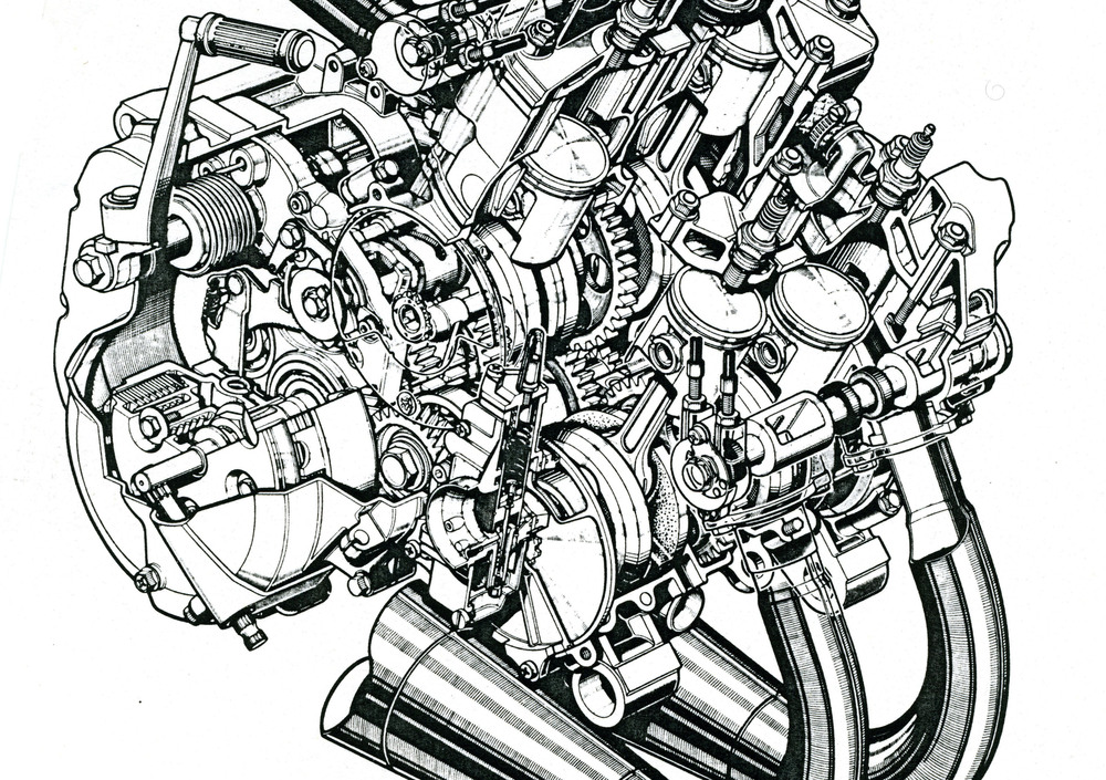 Questo servizio sui 500 quadricilindrici con aspirazione controllata da disco rotante non sarebbe completo senza un doveroso accenno a un interessante motore nato e sviluppato per le competizioni motonautiche, il tedesco Konig. In questo caso i cilindri erano orizzontali e contrapposti. Due erano rivolti in avanti e due all’indietro. Una trasmissione primaria a catena inviava il moto a un cambio separato. L’azienda berlinese ha iniziato a lavorare su di una moto da competizione nel 1969, ma si è impegnata con decisione in tale settore solo un paio di anni dopo, in larga misura grazie al lavoro del tecnico-pilota Kim Newcombe. Il motore era caratterizzato dalla presenza di un solo disco rotante, piazzato nella parte superiore del basamento e azionato da una cinghia dentata. Dopo alcuni risultati molto significativi colti nel 1972 in gare internazionali, la moto, che disponeva di una novantina di cavalli a un regime dell’ordine di 10.000 giri/min, ha ottenuto svariati ottimi piazzamenti, oltre alla vittoria nel GP di Iugoslavia, che hanno portato Newcombe a piazzarsi secondo nel mondiale. Un risultato amaro, perché il forte pilota neozelandese è morto in una gara inglese nell’agosto di quello stesso anno, con ancora un GP da disputare… A causa di questa sventura la Konig ha perso interesse nelle moto da competizione, ma ha continuato a sviluppare i suoi motori per impiego sui sidecar, arrivando alla conquista del titolo iridato nel 1975 e nel 1976.