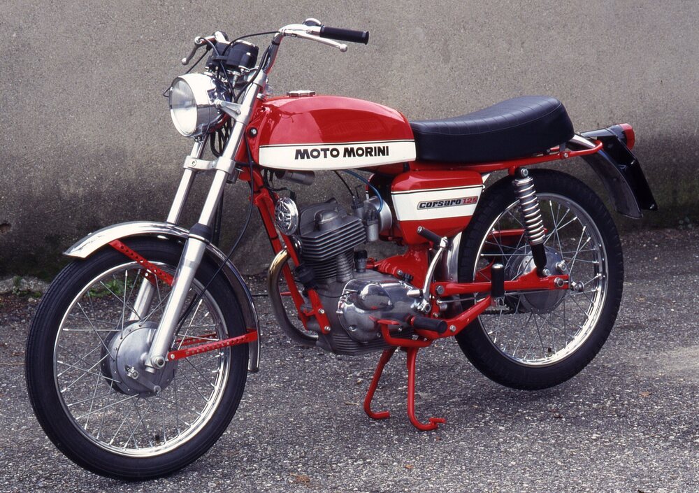 Nessuno avrebbe potuto sospettare, all’epoca della sua presentazione, che questo modello semplice e senza alcuna pretesa prestazionale sarebbe stato il capostipite di una serie di moto di grande successo e dalle prestazioni eccellenti, per la loro epoca, ovvero di tutte le versioni del Corsaro. La prima è stata presentata alla fine del 1958. Aveva una cilindrata di 125 cm3, ottenuta portando l’alesaggio a 56 mm, era alimentata da un carburatore da 18 mm ed erogava 7,7 cavalli. Il telaio era interamente in tubi di acciaio e aveva una struttura a culla aperta; le ruote erano da 18 pollici. Ben presto l’azienda bolognese ha pensato a una versione più sportiva, in grado di offrire prestazioni più elevate e nel 1961 ha presentato il Corsaro Sprint che però non è entrato in produzione con tale denominazione; leggermente riveduto è diventato infatti il Corsaro Veloce, grande novità della Morini per il 1962. Per questa moto, che era dotata di un carburatore da 20 mm, veniva indicata una potenza di nove cavalli. L’accoglienza da parte del mercato è stata buona, ma i numeri di vendita sono diventati davvero eccellenti solo nella seconda metà degli anni Sessanta (e sono rimasti elevati anche nella parte iniziale del decennio successivo). Un ottimo restyling, che ha reso la moto assai più appetibile da parte dei giovani, ha avuto luogo nel 1965. Il cambio a cinque marce è stato adottato nel 1969, quando il modello ha visto mutare radicalmente la sua estetica e la sua denominazione è diventata Corsaro Super Sport; per il motore veniva indicata una potenza di 10,8 cavalli a 9600 giri/min. Nel 1972 c’è stata una ulteriore rivisitazione stilistica ed è stata impiegata una nuova testa, con alettatura più estesa e decisamente “squadrata”; la potenza dichiarata è passata a ben 12,4 cavalli (un valore forse leggermente ottimistico, ma il Corsaro andava davvero forte…). La produzione di queste ottime moto è terminata alla fine del 1974.