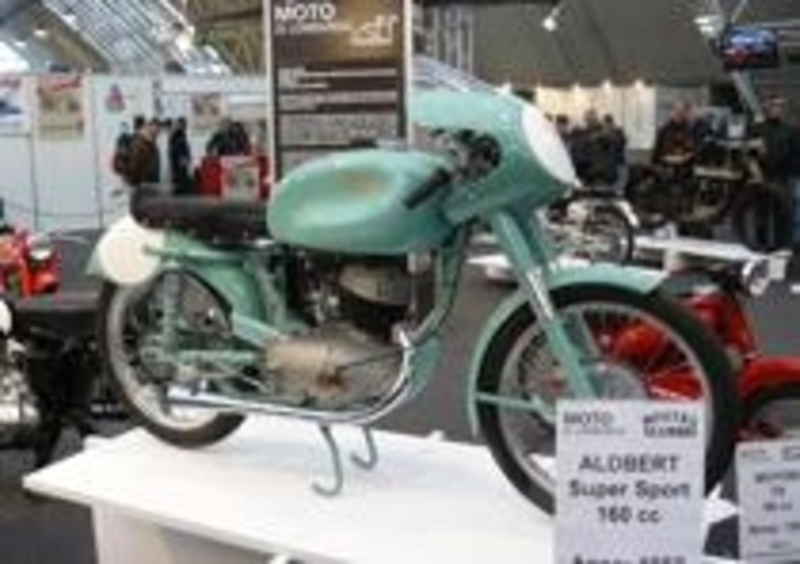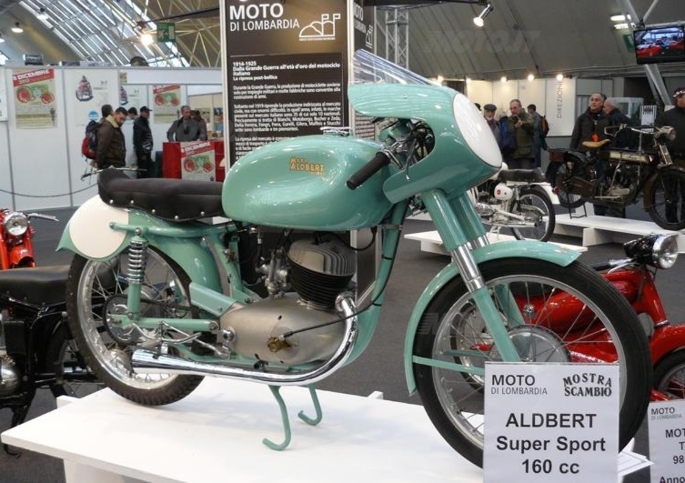 La Aldbert era una casa milanese di modeste dimensioni, ma che produceva moto di ottima fattura e dalla estetica molto lineare e moderna in relazione ai tempi. In genere avevano una tipica colorazione verde chiaro. Il modello più famoso di questa azienda, che è stata attiva all’incirca dal 1951 al 1958, è stato il 175 ad aste e bilancieri, ma il 160 SS a due tempi esposto a Novegro è forse ancora più raro. Il motore, dotato di cilindro in ghisa, aveva un alesaggio di 56 mm e una corsa di 62 mm; la trasmissione primaria era a catena e il cambio a quattro marce.