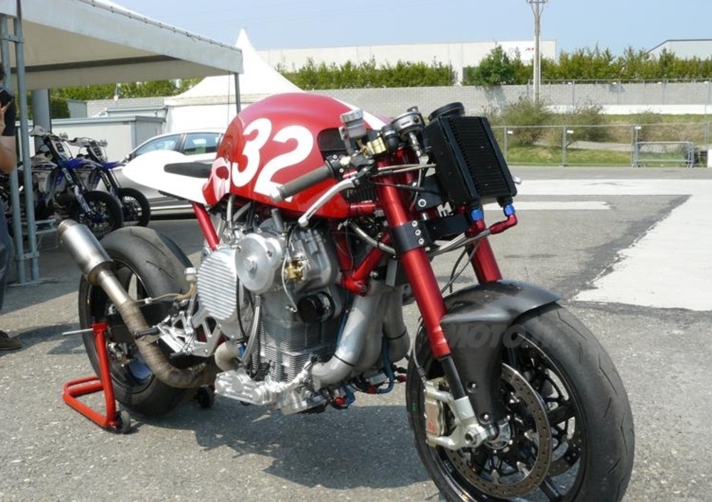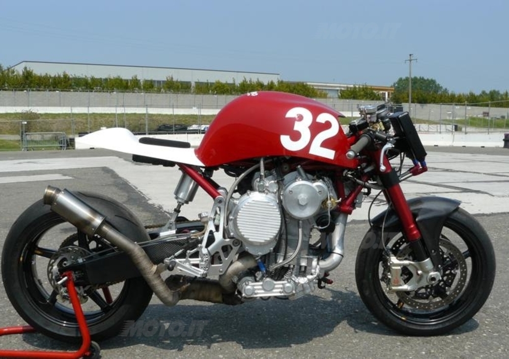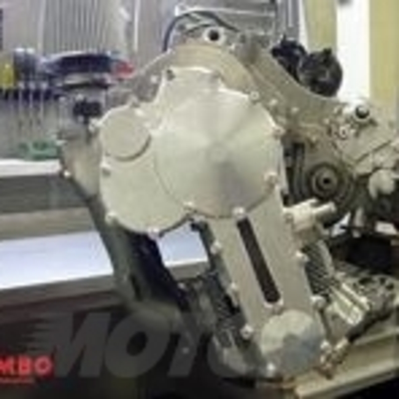 Per quanto riguarda l’aspetto tecnico, Sabatini ha voluto realizzare qualcosa di decisamente lontano dalle architetture convenzionali. Tanto per cominciare, ha deciso di sviluppare un motore di grossa cilindrata, in grado di erogare una potenza analoga a quella delle attuali 1000 sportive senza dovere ruotare a regimi molto elevati e di fornire una coppia impressionante su di un ampio arco di regimi, con una straordinaria trattabilità. Attualmente siamo attorno ai 170 Nm, ma il motore è ancora nella versione di 1800 cm3. Per quella definitiva verranno realizzate nuove fusioni di testa e cilindri (quelli attuali tradiscono la loro derivazione automobilistica); pure il basamento e i coperchi laterali subiranno delle modifiche. La cilindrata salirà a 2000 cm3, con una potenza dell’ordine di 200 cavalli a soli 7500 giri/min.