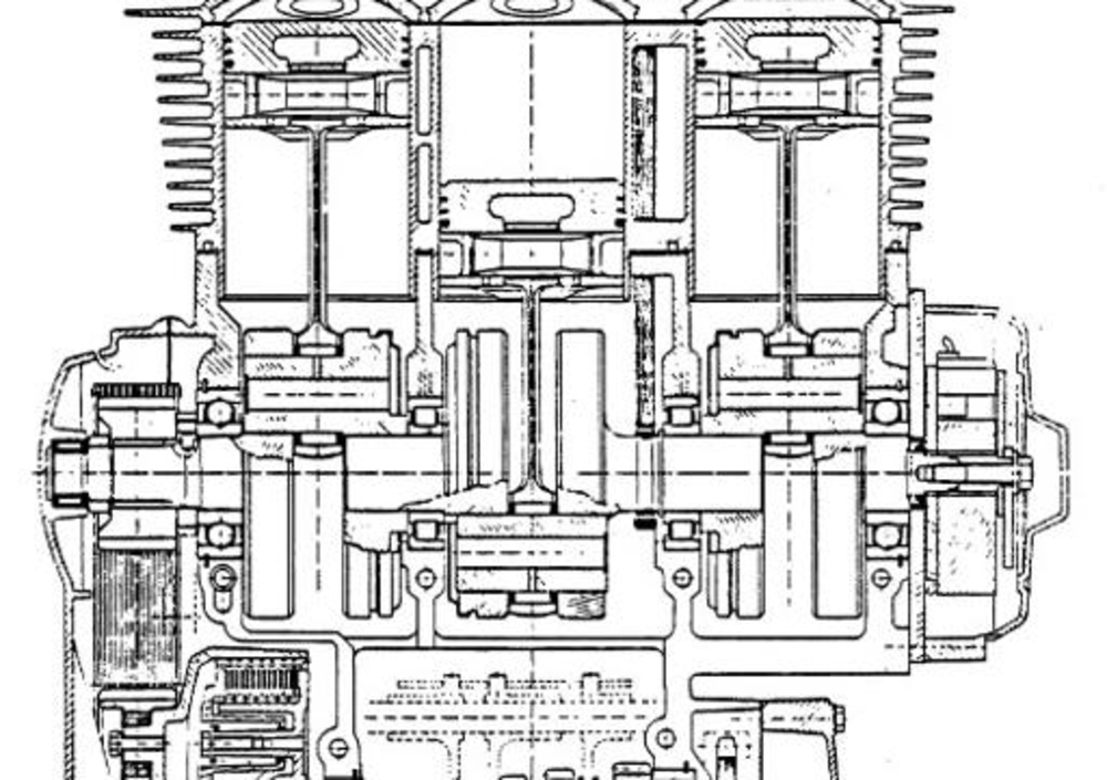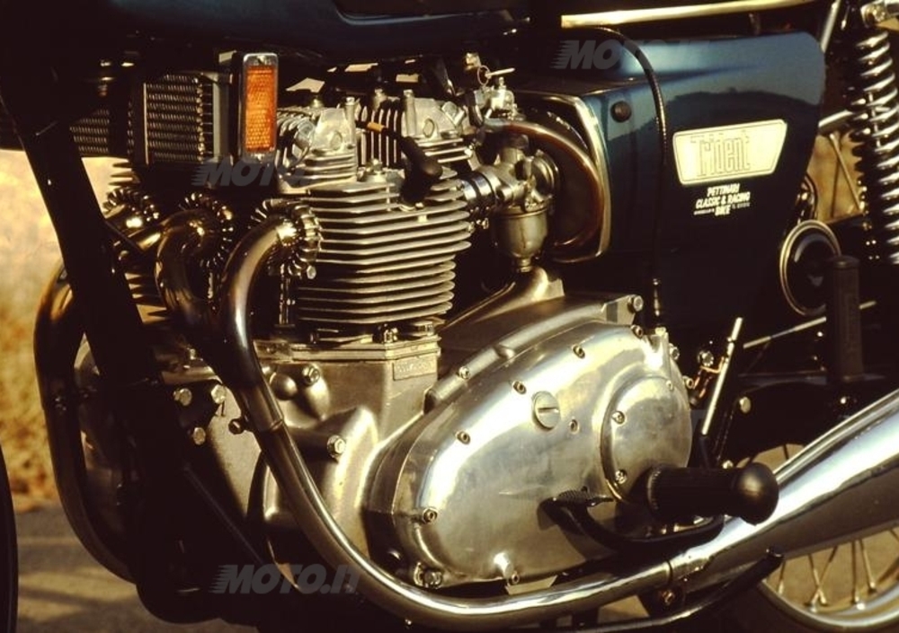 L’architettura a tre cilindri in linea ha fatto la sua comparsa in grande stile tra le moto di serie con le bellissime Triumph Trident 750 e BSA Rocket 3 nel 1968. I motori riprendevano le soluzioni tecniche impiegate nei bicilindrici Triumph e in effetti a prima vista potevano sembrare dei 500 T100 con l’aggiunta di un terzo cilindro. Erano però frutto di un nuovo progetto, realizzato mantenendo comunque invariati i principali schemi costruttivi a livello di testa, distribuzione e cambio. Rimaneva invariata la distribuzione ad aste e bilancieri con due alberi a camme nel basamento e due valvole per cilindro, fortemente inclinate. Il blocco cilindri era in lega di alluminio, con canne riportate in ghisa. Le bielle erano forgiate in lega di alluminio RR56 (contenente il 2% di rame più minori quantità di ferro, nichel e magnesio), come quelle dei bicilindrici. Completamente diverso rispetto a questi ultimi era l’albero a gomiti, con manovelle a 120°, forgiato in un unico pezzo e poggiante su due supporti laterali dotati di cuscinetti a rotolamento più due centrali muniti di bronzine. Le pompe dell’olio (di mandata e di recupero) erano a ingranaggi e non più a pistoncino, come nei bicilindrici Triumph. Il motore aveva un alesaggio di 67 mm e una corsa di 70 mm ed erogava 58 cv a 7.250 giri.