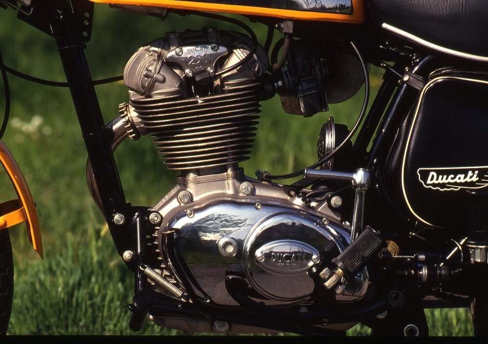 Nella primavera del 1968 a Borgo Panigale sono entrati in produzione i nuovi monocilindrici di 350 e di 250 cm3 a carter larghi, presentati al salone di Colonia dell’anno precedente, e con loro hanno esordito i nuovi Scrambler, che hanno avuto uno straordinario successo anche in Italia, oltre che negli USA, e che hanno dato un contributo fondamentale alla creazione della leggenda Ducati. La versione di 450 cm3 è arrivata nel 1969. I motori di questa serie, punto finale della evoluzione degli straordinari monocilindrici monoalbero con comando della distribuzione ad alberello e coppie coniche progettati dall’ing. Taglioni, riprendevano le stesse soluzioni tecniche già impiegate nei modelli precedenti, rispetto ai quali avevano però subito una completa rivisitazione, al punto che i componenti intercambiabili erano davvero pochissimi. La differenza principale, per quanto riguarda l’aspetto esteriore, era costituita non tanto dalla larghezza del basamento (la diversità era in effetti assai modesta), quanto dal fatto che la coppa dell’olio si estendeva per tutta la lunghezza del motore e che gli attacchi posteriori al telaio erano molto più larghi.