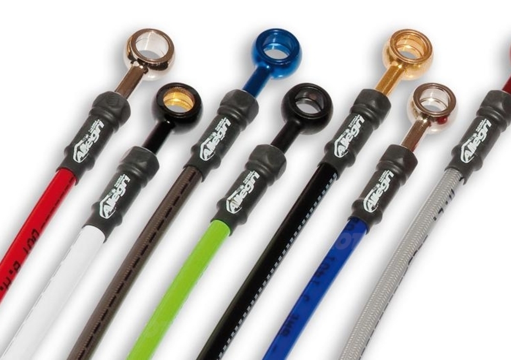 Per ovviare a questo limite, nelle moto di prestazioni più elevate vengono in genere impiegate delle tubazioni flessibili di tipo aeronautico, con guaina resistente in treccia metallica o, talvolta, di fibre aramidiche. Non tutte sono eguali, però… La MotorQuality commercializza degli interessanti kit di tubazioni flessibili, prodotte dalla ditta Allegri, dalle caratteristiche eccellenti. Sono costituite da una parte interna in PTFE, da una guaina in treccia di acciaio inox e da un rivestimento esterno in Rilsan, una plastica poliammidica. Il PTFE, che in pratica è noto universalmente come Teflon (nome depositato dalla DuPont), abbina una straordinaria stabilità chimica a una eccellente resistenza al calore e in questo caso costituisce anche una eccezionale barriera nei confronti della umidità atmosferica (grande nemica dei liquidi per freni). L’acciaio impiegato contiene il 18,5 % di cromo e il 9,5 % di nichel; assicura la massima resistenza e contiene in valori minimi l’assorbimento volumetrico. Il Rilsan assicura protezione, funge da ulteriore barriera nei confronti dell’umidità e svolge anche una funzione estetica. Queste tubazioni sono omologate DOT e vengono tutte collaudate sotto una pressione (200 bar!) di gran lunga più elevata di quella massima che possono incontrare in servizio.