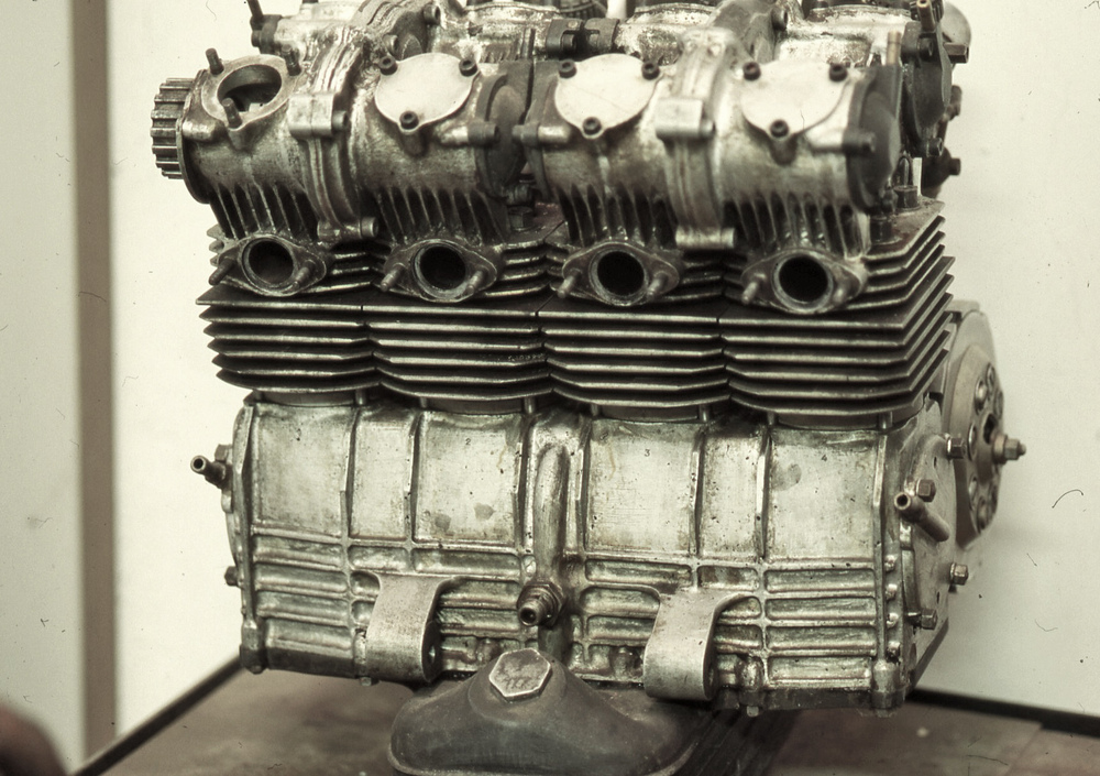 Nel 1966 è arrivata la notizia di una straordinaria quadricilindrica da Gran Premio, che avrebbe dovuto essere realizzata nelle cilindrate di 250 e di 350 cm3. Il progetto però non era nato né alla Ducati né alla Mototrans. Il disegno originale era infatti stato tracciato nel 1965 dall’ing. Aulo Savelli ed era stato successivamente sviluppato principalmente da Armaroli, che aveva lavorato con lui alla Benelli fino a poco tempo prima. Savelli aveva lasciato la casa di Pesaro (dove si era trasferito poco dopo essersi laureato, nella seconda metà degli anni Cinquanta) per aprire un proprio studio di progettazione e consulenza nel 1963. Quella di rivolgersi a lui, che già aveva progettato un 250 di analogo frazionamento e di eguale cilindrata (quello dalla Benelli da GP), per disegnare un nuovo motore da competizione a quattro cilindri era quindi una scelta più che logica.