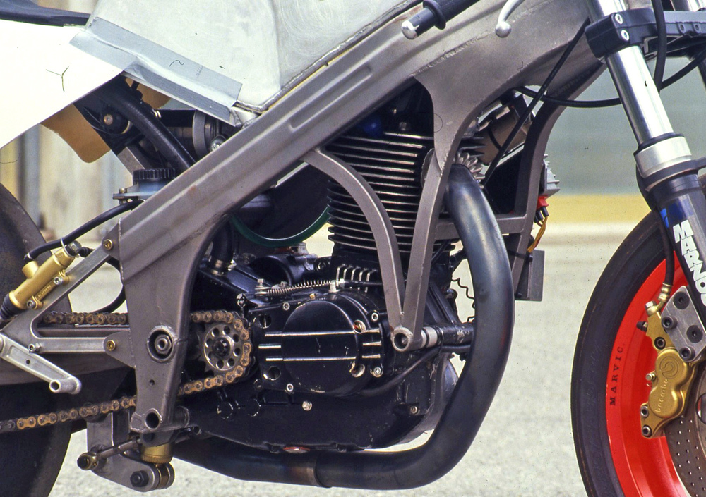 Quasi tutti i componenti del primo prototipo sono stati realizzati a Bologna, dove sarebbe stato anche assemblato il primo prototipo, operazione effettuata in grande segretezza all’interno di una nota officina. La leggenda vuole che, non essendo pronto per le prime prove il nuovo cambio, sia stato impiegato quello di una Husqvarna… Secondo una fonte, quello realizzato in Italia sarebbe stato un motore di 350 cm3 (misure caratteristiche = 79,5 x 70 mm) che poi il tecnico della casa spagnola Millet avrebbe modificato, forse con la consulenza di Franco Farné, adottando un alesaggio di 86 mm e apportando alcune variazioni di dettaglio. La cosa non è comunque certa.