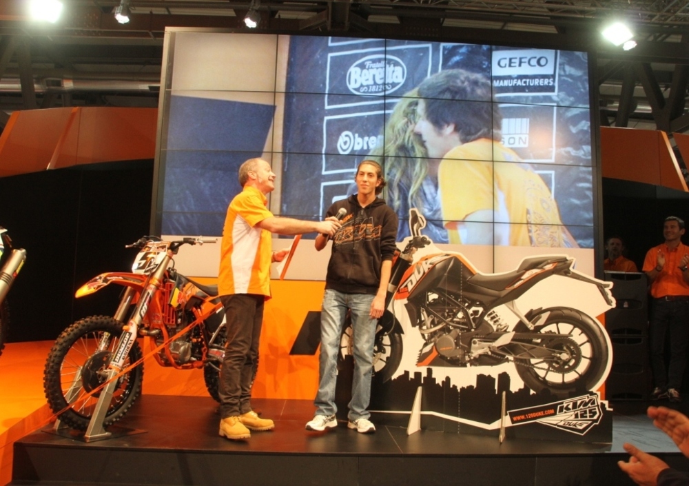 La premiazione si è svolta sabato 12 novembre a EICMA, presso lo stand KTM al padiglione 18. Mathias, presente con la famiglia al completo, ha ricevuto “simbolicamente” il cartonato della 125 Duke che verrà presto sostituita con la due ruote vera. Numerose altre iniziative legate alla 125 Duke sono in programma nei prossimi mesi per cui invitiamo gli appassionati a visitare la pagina Facebook della 125 Duke e il sito ufficiale www.ktm.com