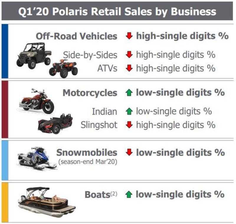 Il Gruppo Polaris ha visto i suoi ricavi globali scendere del 6% nel primo trimestre (a 1.495 milioni di dollari), ma all'interno delle sue attività quelle motociclistiche sono andate meglio di tutte le altre, le sole a guadagnare.
