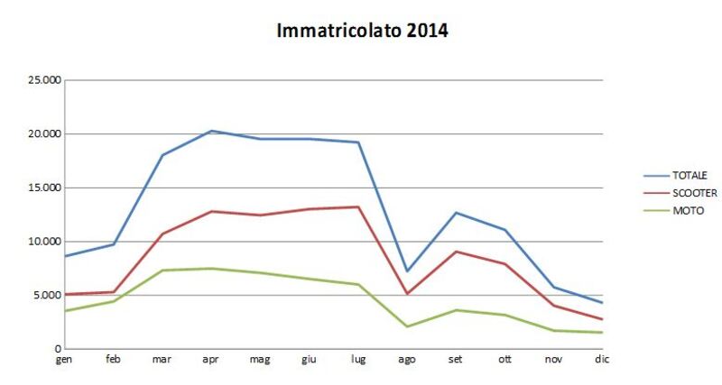 Il mercato 2014, tolti i ciclomotori, ha perciò conosciuto una lievissima ripresa (meno di due punti percentuali) tuttavia è giusto sottolineare l'importanza di questa piccola ma significativa inversione di tendenza. Perché va detto che il 2013 si era chiuso sì con 153.863 moto e scooter venduti, ma aveva perso il 20% rispetto al 2012 (-11% le moto e -24% gli scooter), addirittura il 25% se si tiene conto della commessa di Poste Italiane avvenuta proprio nel 2012. E il 2012, con 206.422 immatricolazioni, aveva chiuso a -19% rispetto al 2011.