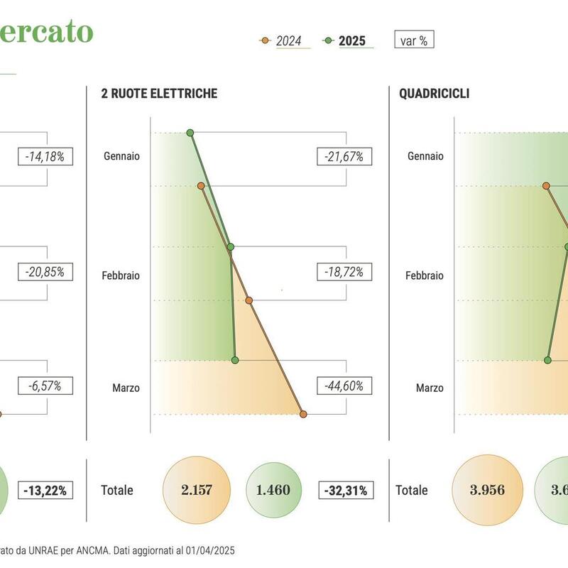 I dati mensili elaborati da UNRAE per Confindustria ANCMA che riguardano il mercato delle due ruote elettriche non sembrano riportare al momento alcun beneficio dovuto al rientro in vigore degli incentivi statali. Il portale è rimasto bloccato a lungo e soltanto dallo scorso 18 marzo è ricominciata la possibilità di prenotare il cosiddetto ecobonus. Questo chiaramente come non aveva giovato al segmento nei primi due mesi dell'anno alla fine non ha giovato neppure al terzo e perciò il trimestre si chiude con una negatività pesante. Occorrerà aspettare il prossimo mese di aprile per avere una situazione più chiara di quanto effettivamente stia funzionando o meno questo sostegno statale. A marzo le due ruote elettriche perdono ancora il 44,60%, pari a 605 veicoli registrati. Sul trimestre la flessione è del 32,31%, pari a 1.460 i mezzi venduti.