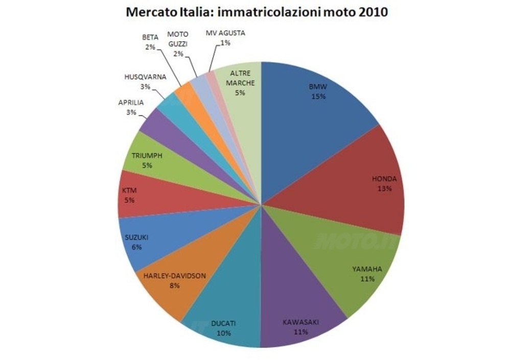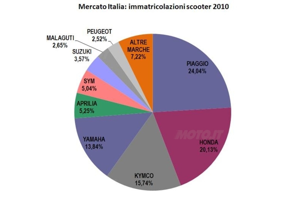 I grafici illustrano i risultati delle immatricolazioni in Italia nel 2010. BMW coglie il migliore risultato tra le moto, mentre Piaggio vince nel segmento scooter. Il dato complessivo di moto e scooter premia Honda