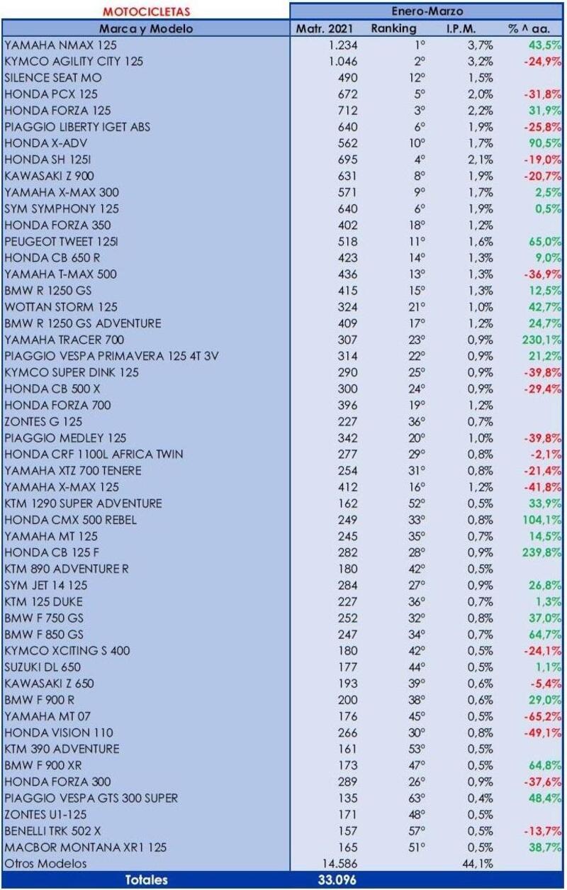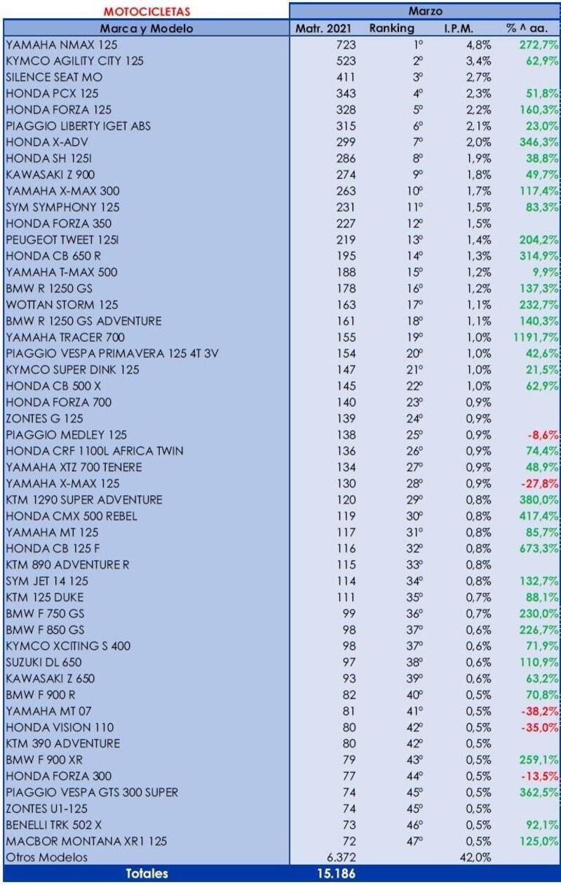 L'elenco dei modelli segue la classifica di marzo, mentre il Ranking si riferisce a quello del primo trimestre. Fra le moto i modelli più venduti sono ancora Z900 (nonostante un -20 sul 2020), CB650R, R 1250 GS e Adventure, Yamaha Tracer 7 (+230%) e le Honda CB 500X, CB 125 F e Africa Twin 1100.