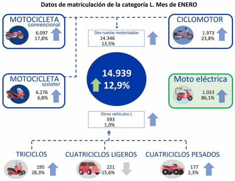 I motocicli immatricolati a gennaio in tutta la Spagna sono stati 12.373 (+12%), rappresentando l’83% delle vendite, mentre i ciclomotori sono a loro volta aumentati del 23,8% totalizzando 1.973 unità.