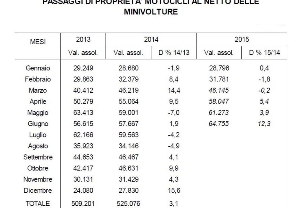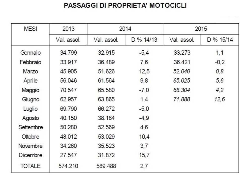 Il mercato dell'usato per il settore dei motocicli - le statistiche disponibili mettono assieme il dato di moto e scooter - continua a tirare anche nel 2015. Nello scorso mese di giugno i passaggi di proprietà netti, ovvero depurati dalle minivolture, hanno toccato il loro massimo dal 2012 arrivando a quota 64.755.