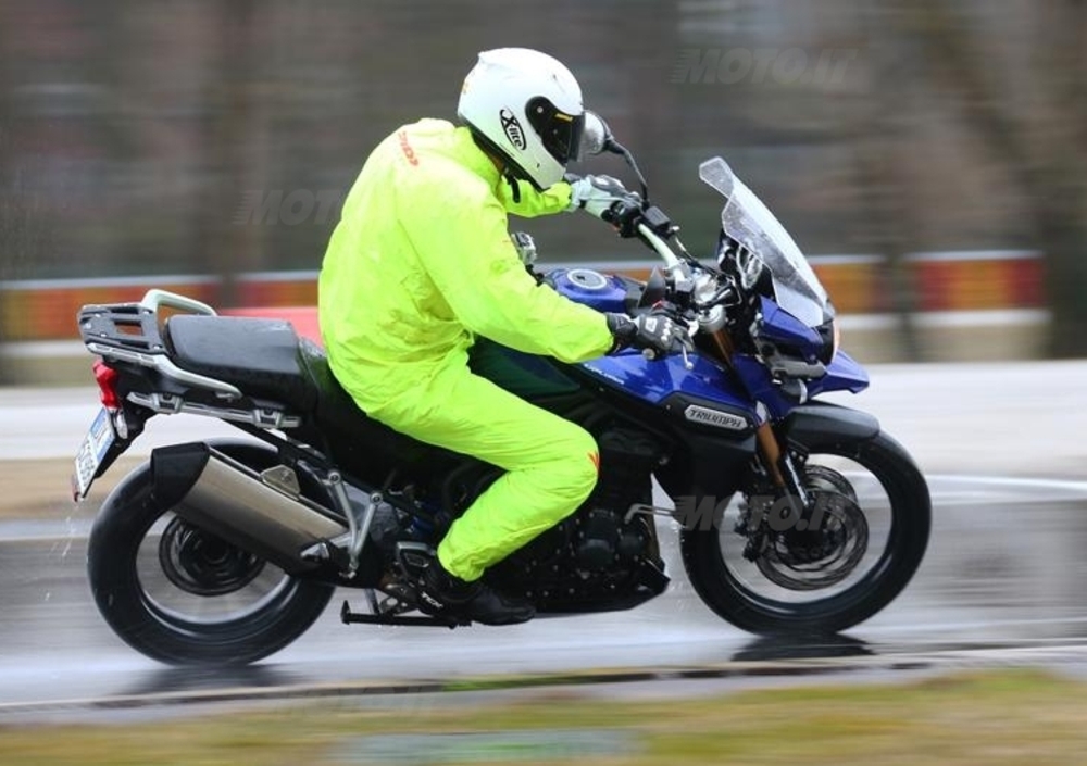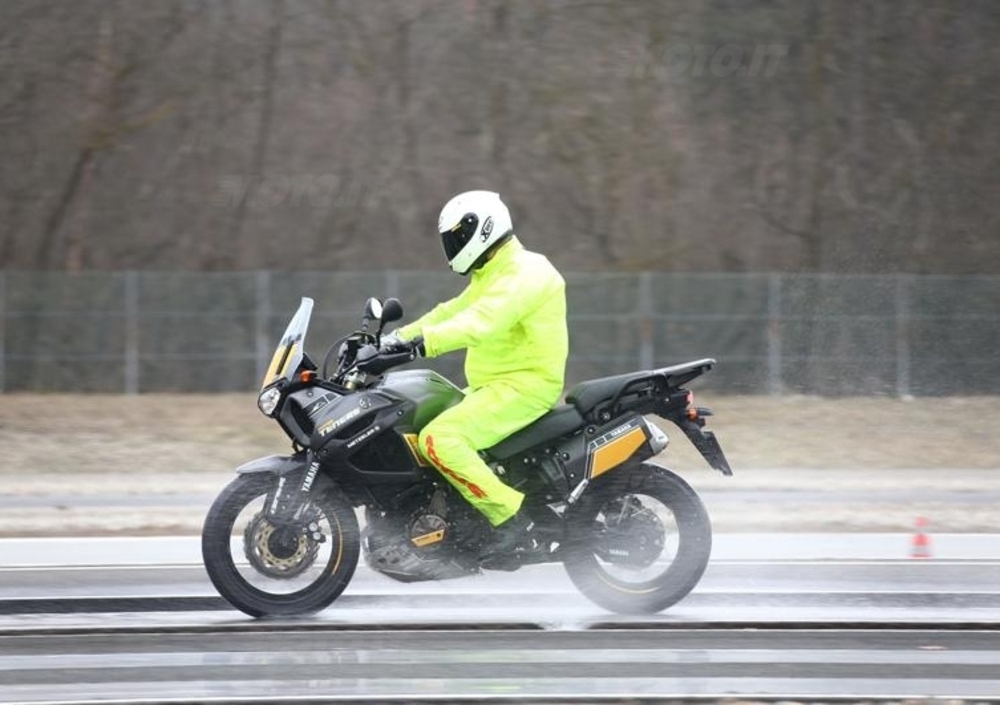 In questo frangente (test di frenata da 80 km/h a 0 su asfalto bagnato) i pneumatici Metzeler hanno svolto un ottimo lavoro sia col sistema Telelever della BMW (che impedisce lo schiacciamento della forcella e quindi limita i trasferimenti di carico sull’anteriore), sia con le forcelle tradizionali di Honda, Triumph e Yamaha. Con queste ultime è fondamentale agire sulla leva con decisione, va evitato però un attacco troppo brusco che comprima la forcella in modo eccessivo, causando un ritorno veloce che provoca l’intervento dell’ABS.
