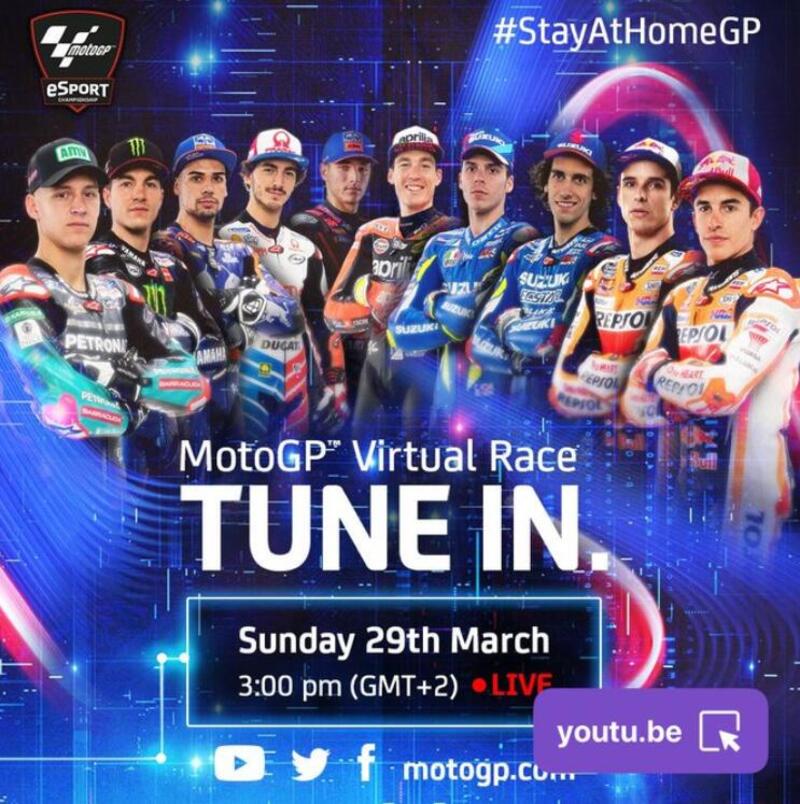 Alcuni di loro sono dei player incalliti, divoratori di videogames che,m a dispetto di post sui social dove comunicano infinite capacità di resilienza, soffrono la mancanza di adrenalina; con il supporto di Dorna, hanno deciso che se non possono andare in circuito, sarà il circuito ad andare da loro: #StayAtHomeGp è l'evento previsto per domenica 29 marzo dove Marc e Alex Marquez, Maverick Viñales, Aleix Espargaro, Alex Rins, Joan Mir, Fabio Quartararo, Iker Lecuona, Miguel Oliveira e Francesco Bagnaia si sfideranno online al videogame MotoGP19 in una gara virtuale di sei giri al Mugello: per tutti noi sarà possibile vedere lo show su motogp.com, esport.motogp.com, YouTube, Twitter, Instagram e Facebook.