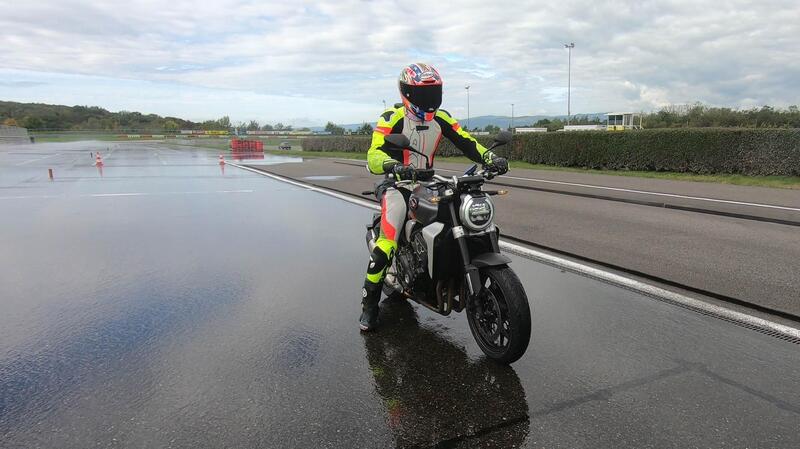 Abbiamo iniziato con 10 giri gommati Road 5 e poi abbiamo proseguito con altri 10 giri sulle Road 6. Quello che ci premeva verificare era il feeling e la capacità di gestire situazioni di emergenza un po' al limite come l'ingresso in curva a freni tirati o il panic stop, situazioni dove l'evoluzione rappresentata dalle Road 6 si percepisce appieno. Non che le Road 5 siano poco a loro agio sull'acqua, ma il confronto con le 6 mette in mostra una capacità di restituire con fedeltà un limite di grip che sembra volersi spostare sempre più in là, sia in frenata che in percorrenza dove la sicurezza in piega garantita dalle 6 è certamente un deciso passo in avanti. Sembrerà un disco incantato ma anche qui la stabilità è la cifra distintiva delle 6 con le quali ci siamo trovati a guidare con più scioltezza e sicurezza derivata anche da un comportamento già sincero e prevedibile dopo pochissime curve.
