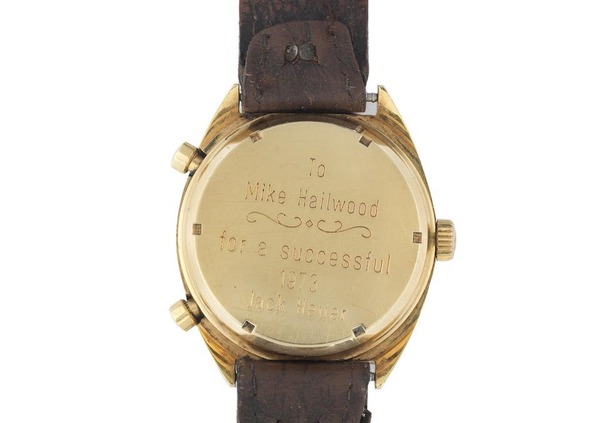 L’orologio, sul fondello, riporta la dedica “To Mike Hailwood for a successful 1973 Jack Heuer”, con la quale il proprietario della casa orologiera augurava una buona stagione al pilota. Questo specifico modello di cronografo, il 1158CHN Carrera è, già di per sé, un esemplare molto ambito dai collezionisti di tutto il mondo, in quanto si stima che sia stato realizzato in meno di 500 esemplari e, con il proprio pedigree, sicuramente questo esemplare è quello maggiormente ricercato tra tutti.