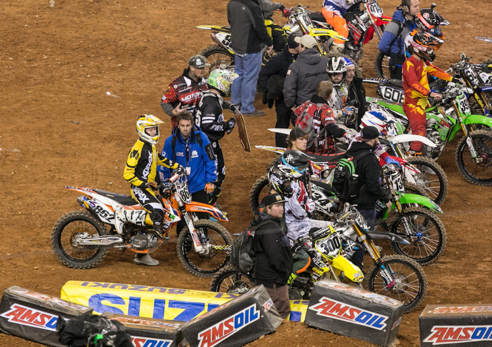 «Si arriva al venerdì, il più presto possibile. Talvolta si viaggia, talvolta si prende l’aereo, dipende dalla distanza e dal budget. Una volta arrivati si verifica che ci sia la moto e che tutto sia a posto: smonti e rimonti le parti più importanti, cambi le gomme, dai una pulita generale e poi si va in albergo. La mattina del sabato, il giorno di gara, si arriva allo stadio verso le 9. Alle 10.30 c’è il giro di ricognizione a piedi della pista poi il meeting piloti con gli ufficiali AMA e FIM. Da mezzogiorno si inizia a fare sul serio, con i turni di prova: prove libere il primo, poi due turni di cronometrate dove bisogna stare dentro ai primi 40 per qualificarsi per la serata. Alla sera dopo la cerimonia di apertura iniziano le batterie di qualificazione e nella 450 hai tre diverse opportunità di qualificarti per la finalissima: arrivi nei primi 4 della batteria, arrivi nei primi 5 della semifinale o arrivi tra i primi quattro della LCQ, la Last Chance Qualifier ovvero la batteria della disperazione dove ti giochi il tutto per tutto. Dietro al cancello in finale ci vanno in 22 (8 dalle heat, 10 dalle semifinali e 4 dal recupero, NdA)».