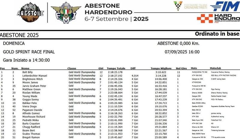 Bolt vince, Lettenbichler e Mitch Brigthmore sul podio, un’eccezionale piccola fila di inseguitori. E qui bisogna fare un distinguo. C’è una classifica Gold Pro e una Gold, in pratica dipendenti dall’iscrizione o meno al Campionato del Mondo. L’Assoluta mette in fila, oltre a Bolt e Lettenbichler, Mitch Brigthmore, James Moore, Graham Jarvis, Matt Green, William Riodan, Wade Young, Sonny Goggia e Felix Bahker in una top ten stellare. La Pro fa a meno di Riodan, Goggia e soprattutto Jarvis, che quindi è il vincitore della sub-categoria Gold. Pro o no, insomma, il risultato è eloquente e comprende ben tre dei “nostri”. L’italiano Sonny Goggia, senz’altro un risultato eccellente, e l’accoppiata quasi clamorosa Moore-Green. Entrambi sudafricani e entrambi Piloti Rigo Racing, Matt Green è definitivamente uno dei big della specialità, James Moore l’ultima scoperta di Marco e Andrea Rigo, eccezionali talent scout che, in questo modo, portano il giovane Pilota a vincere la Junior di Abestone e ad occupare la prima posizione del relativo Campionato del Mondo. In assoluto, Lettenbichler continua a guidare il Mondiale FIM Hard Enduro 2025 con quattro round ancora da disputare. Il primo dei quali sarà l’Hixpania, 20-21 Settembre.