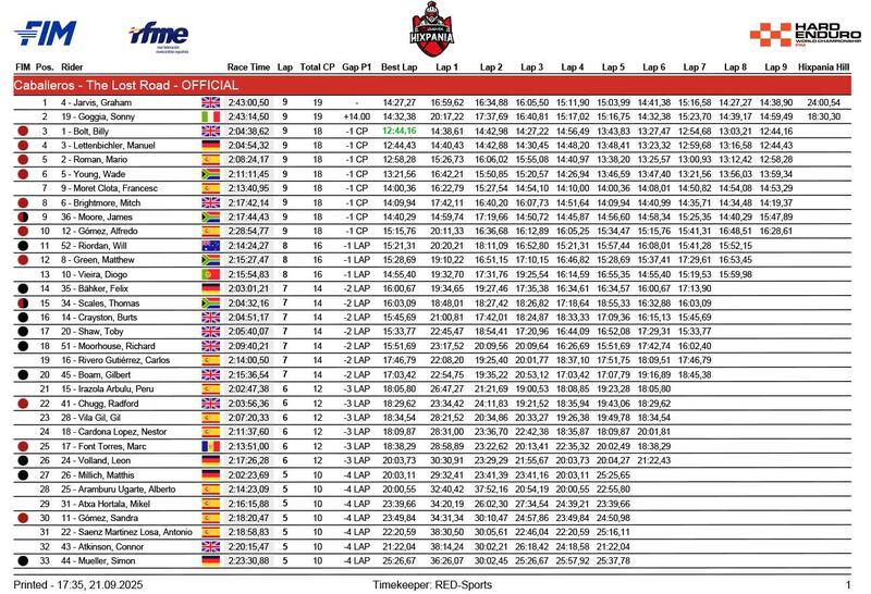 Quando è arrivato Graham Jarvis, Husqvarna, e con lui Sonny Goggia, Sherco, il fuoriclasse inglese si è sentito invitato ad entrare e correre l’X-Loop perché così facendo avrebbe vinto. Graham non ha capito bene, o ha pensato bene di capire nel senso dell’opportunità, si è lanciato dentro e, morale, in effetti risulta essere il vincitore dell’Hixpania 2025, unico insieme a Sonny Goggia, secondo, ad aver complerato il giro(ne) finale. Solo terzo e quarto Billy Bolt e Manuel Lettenbichler, che giravano per lo show e si erano fermati all'ultimo controllo, a seguire Mario Roman e Wade Young. Il fatto curioso è che né Jarvis né Goggia sono iscritti al Campionato del Mondo, e quindi sono esclusi dal punto di vista del punteggio del Mondiale che dunque premia i suoi leader. Bolt ottiene il massimo dei punti iridati a disposizione, Lettenbichler resta al comando della serie, Roman e gli altri a seguire. Per la cronaca, i due piloti “Rigo Racing” (che consideriamo se non proprio italiani almeno… milanesi), James Moore e Matt Green, hanno chiuso al nono posto (6° per il Mondiale) e dodicesimo (poi 9° posto). Gli organizzatori hanno dato la loro versione (delle decisioni, non dei fatti che erano evidenti) e tutti ora si augurano che l’edizione del decennale dell’Hixpania Hard Enduro, l'anno prossimo, vada in onda in un clima di rinnovata, grande armonia.